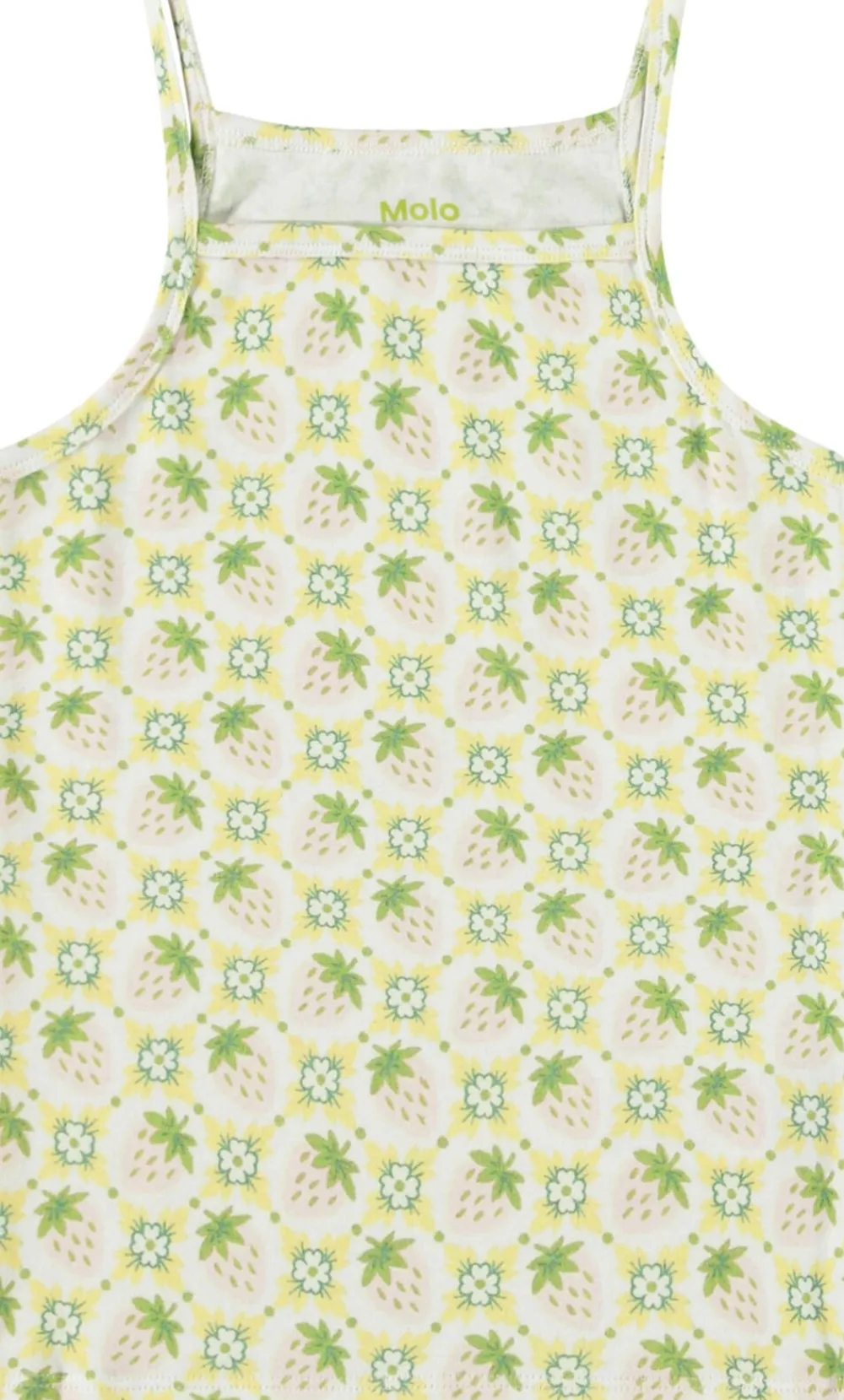Undertøjssæt i råhvid og blød, økologisk bomuld med et fint allover print af lyserøde jordbær og blomster. Sættet inkluderer en undertrøje med tynde stropper og tilhørende underbukser med en bred elastikkant for optimal komfort.