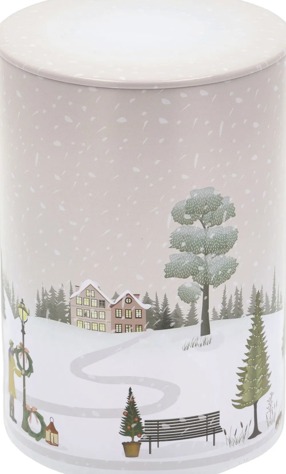 Kagedåse af metal med eventyrlige vintermotiver. Serien Vinter er skabt i samarbejde med designer Dorthe Mathiesen. Hendes motiver med den karakteristiske grafiske streg og lyse, nordiske pastelfarver afspejler stemningen i de hyggelige vintermåneder og fortæller historier fra de små samfund om leg i sneen, stemningsfulde vinterlandskaber og samvær med familie og venner, som beskueren kan hoppe ind i og selv bygge videre på.