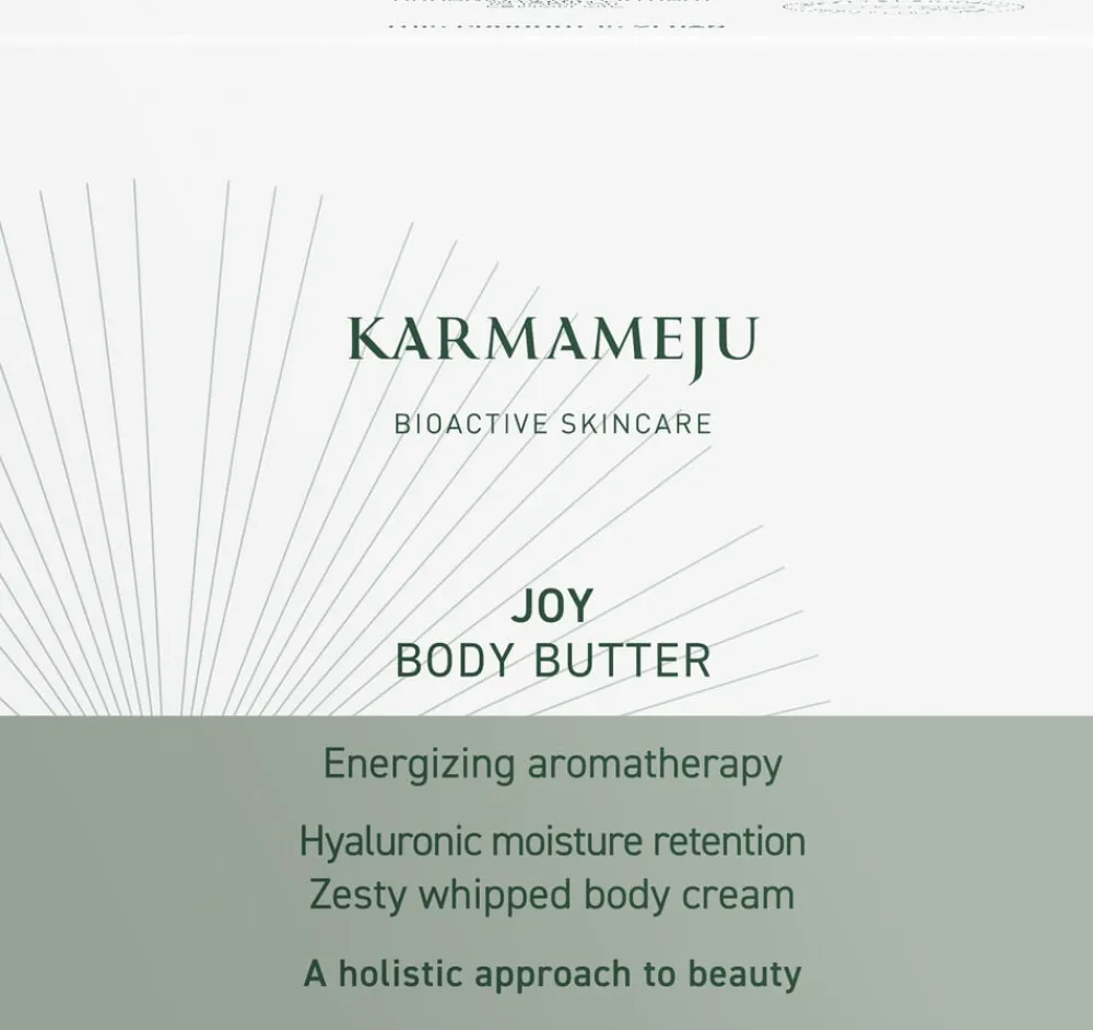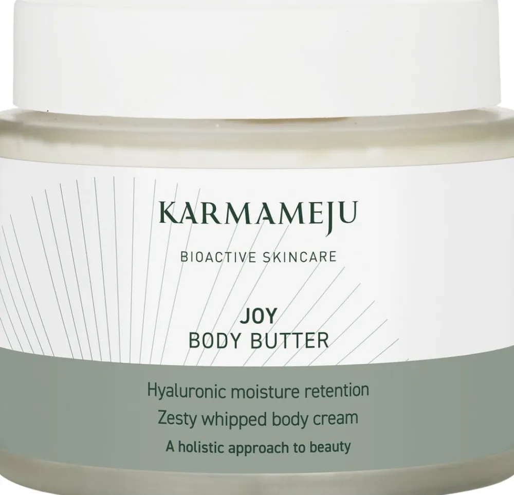 JOY body butter indeholder Karmamejus opløftende signaturduft fra de syditalienske marker. En naturlig aromaterapeutisk sammensætning af citrus, lavendel og mynte, som tager sindet med til sydens sol og sommer.