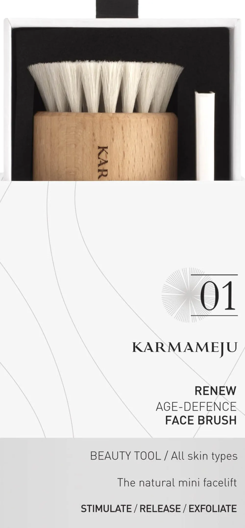 RENEW tørbørste til ansigtet stimulerer og eksfolierer skånsomt huden. Regelmæssig brug hjælper med at forbedre hudens fasthed og reducere hævelser og mørke rande.