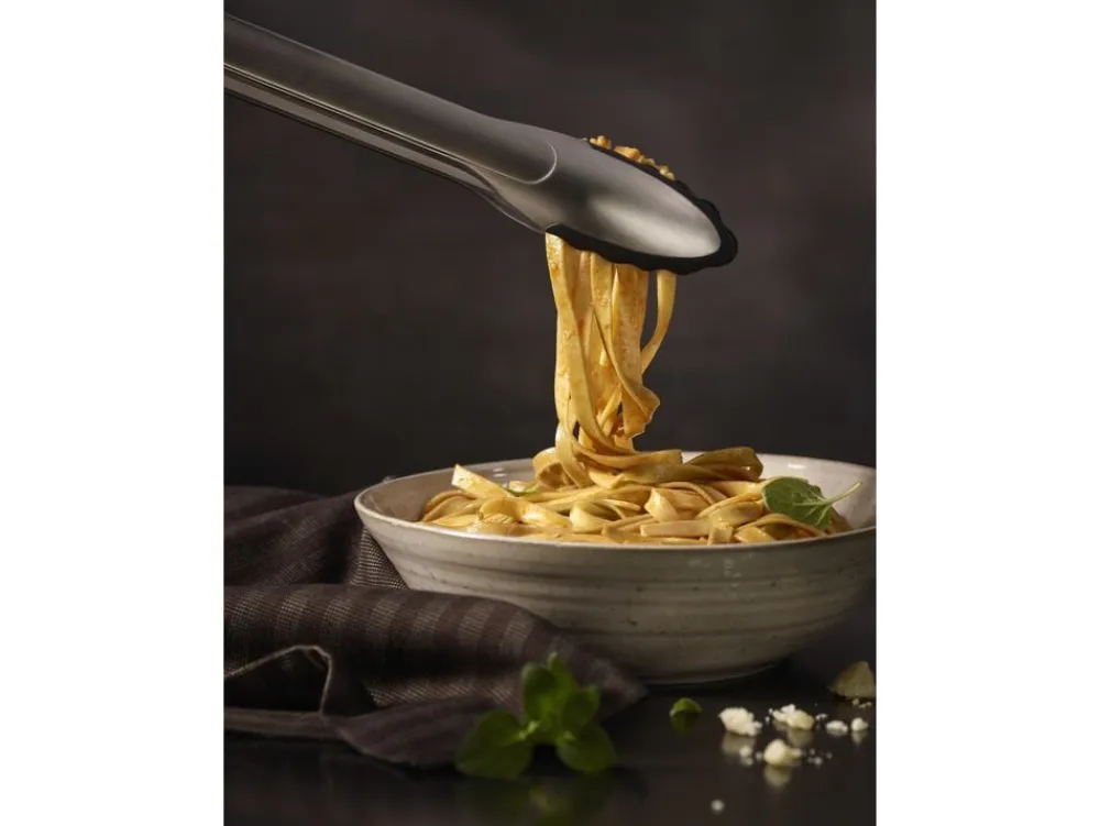 RÖSLE køkkentang med patenteret åbnemekanisme, der gør det muligt at åbne og låse tangen med kun én hånd. Silikonebelægningen forhindrer ridser i kogegrej med belægning eller rustfrit stål. Tåler temperaturer op til 260 °C. Tåler opvaskemaskine. (R12987)