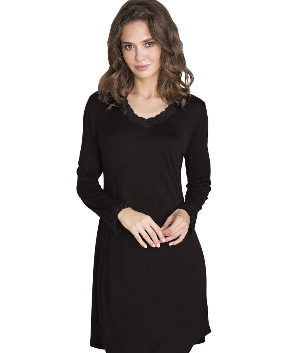 Luksuriøs natkjole lavet af 100% strikket silke, der er meget behagelig at have på. Natkjolen har en afrundet bund og lange ærmer med superbløde blonder ved hals- og ærmeåbninger
