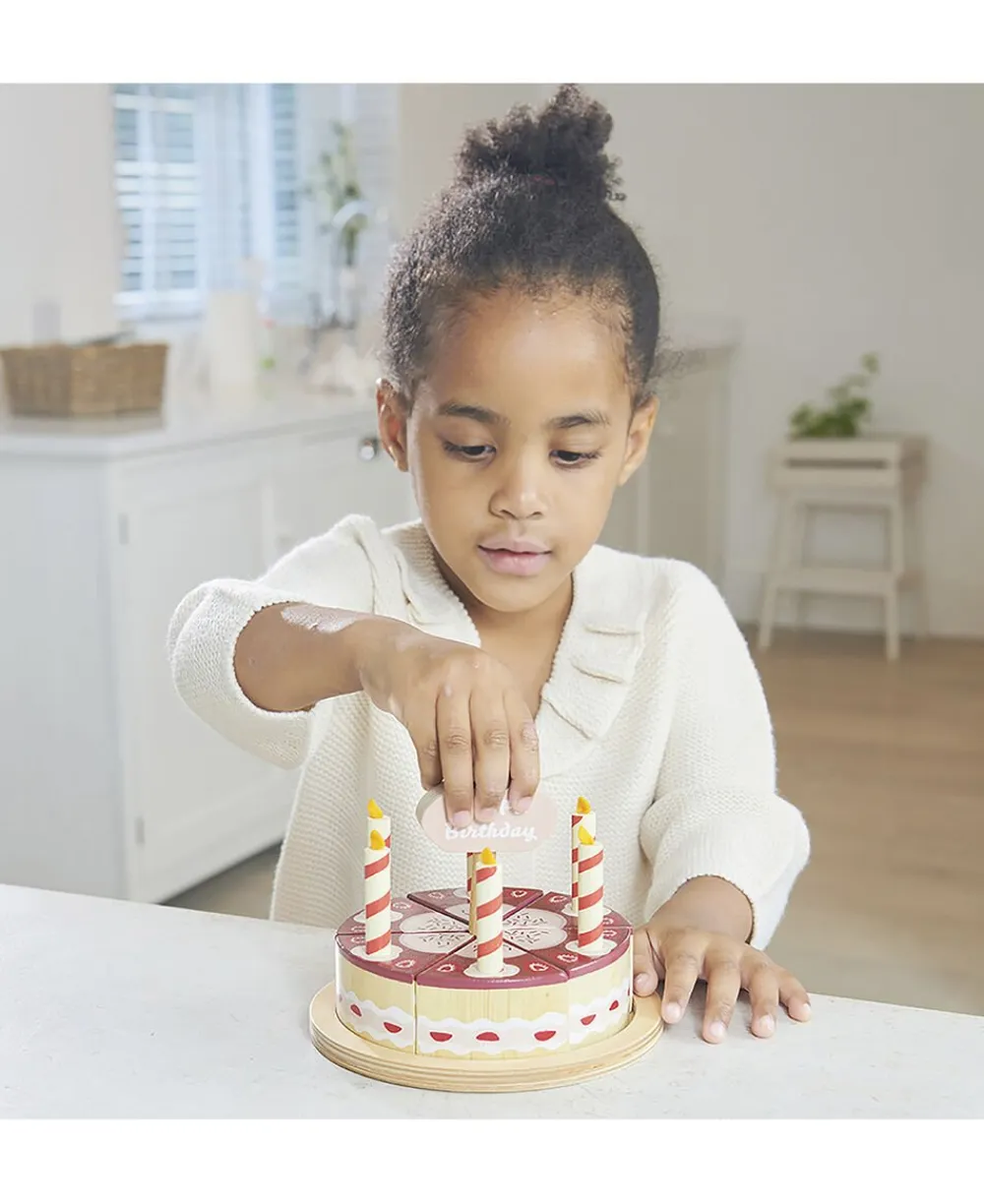 Lagkagen er delt i 6 stykker og leveres på et naturfarvet træfad.