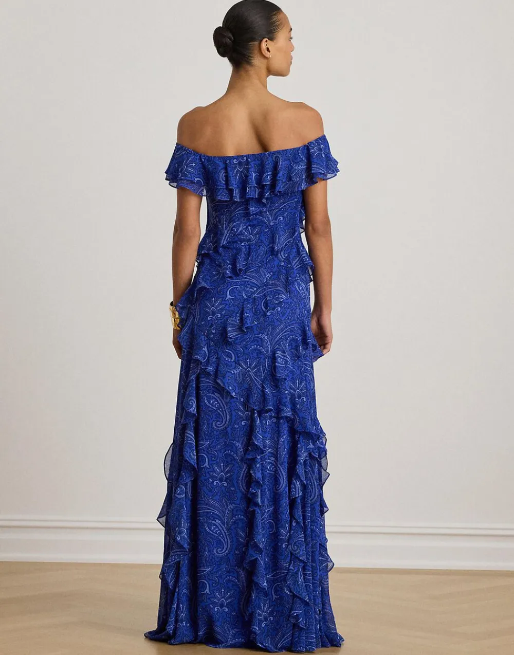 Kaskadede flæser og rynket georgette giver ubesværet bevægelse til denne fantastiske off-the-shoulder-kjole, som skildrer sæsonens tonale sjalsmønster.