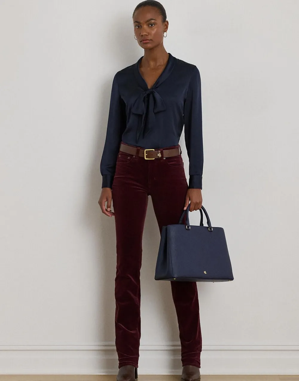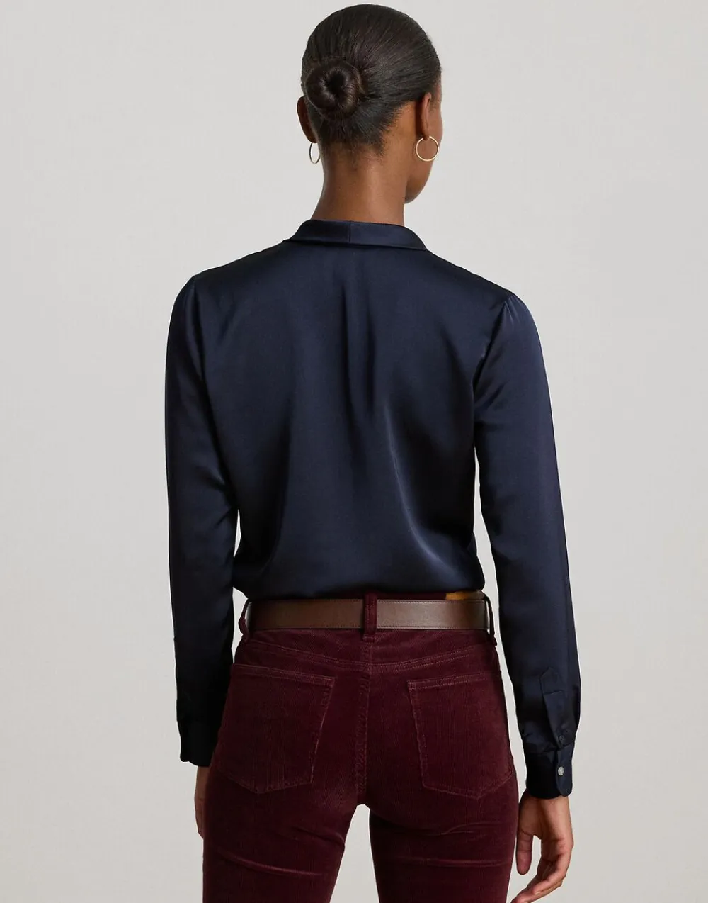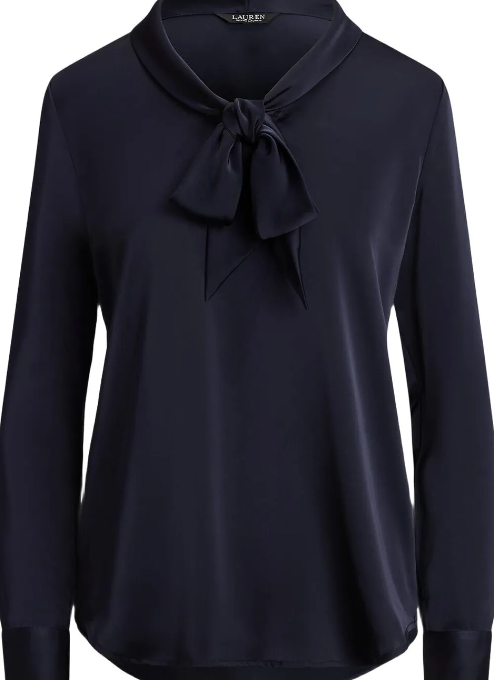 Denne bluse er fremstillet med satin charmeuse for en smuk glans og yndefuld drapering og er kendetegnet ved en bindehals, der danner en voluminøs sløjfe foran