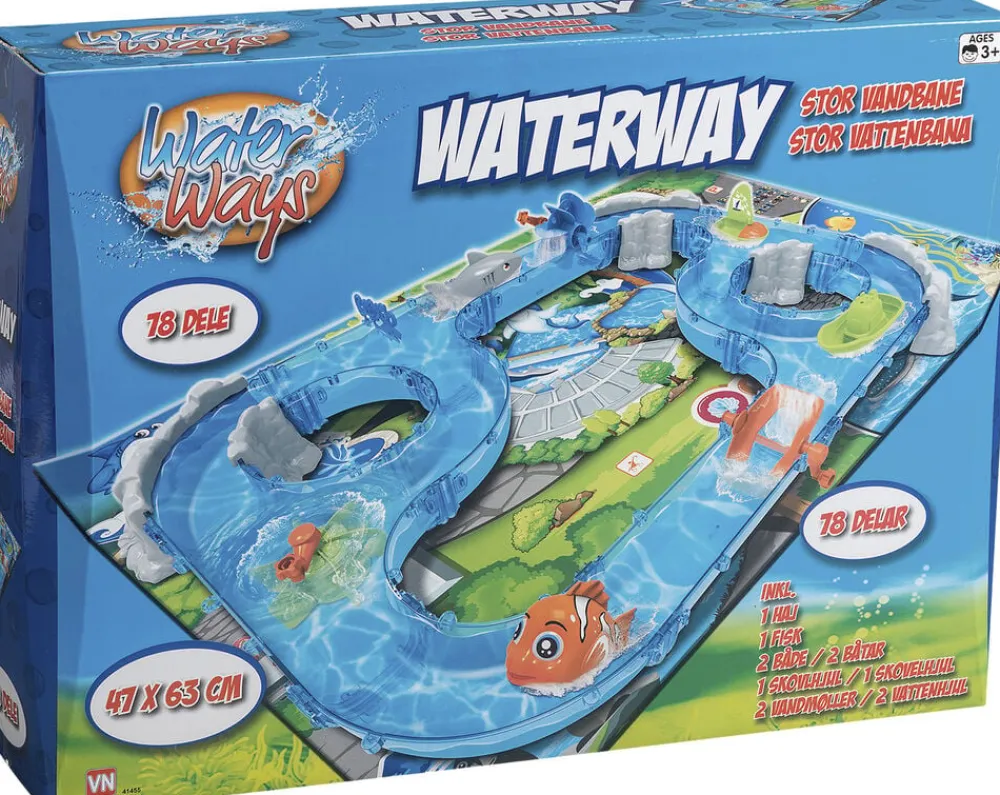Waterways stor vandbane Komplet med skovlhjul, 2 både, 2 vandmøller, fisk og haj 63×47 cm 78 dele