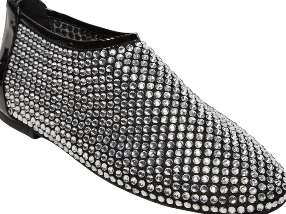 • Ballerina i mesh • Dækket med rhinsten • Rund tå • Lynlåslukning bagpå • Sort lakeret look • Flad sål • 85% mesh, 15% læder