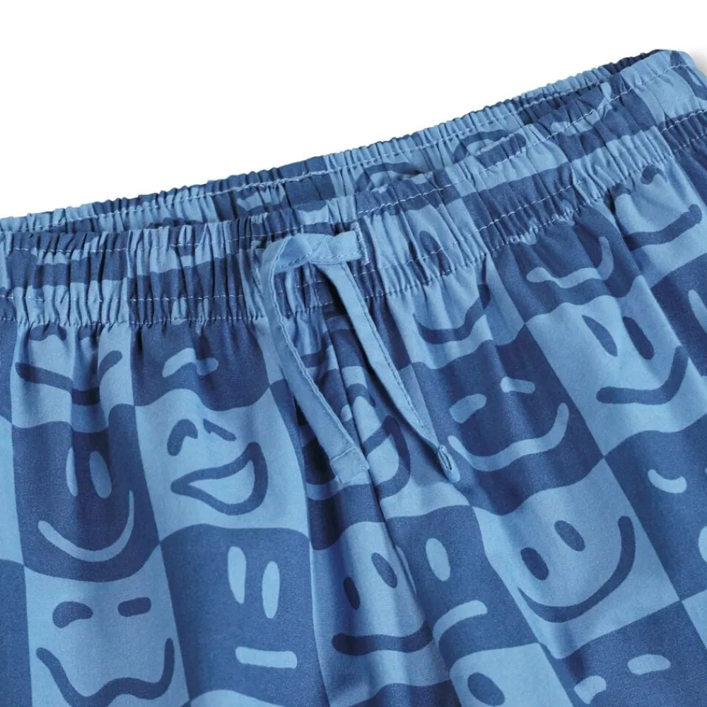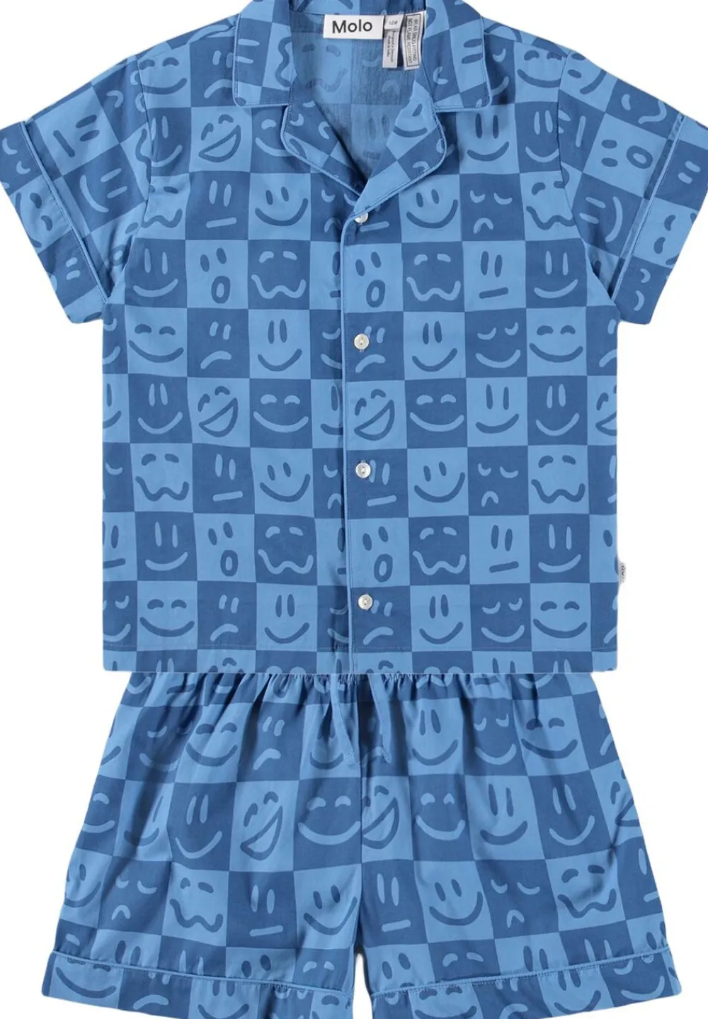 Todelt pyjamas i blød bomuld med korte ærmer og ben. Skjorten har en klassisk krave og knaplukning, mens shortsene er funktionelle med elastik og snøre i taljen for optimal pasform. Det humoristiske print med ansigtstræk gør sættet sjovt og indbydende for børn. Ideelt til en god nats søvn eller hyggestunder derhjemme.
