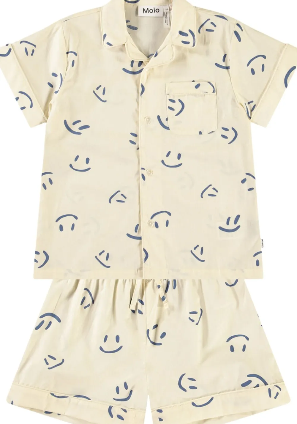 Råhvidt pyjamas-sæt med korte ærmer og ben i økologisk bomuld. Skjorten har en løs pasform, en krave med knapper ned langs fronten, en brystlomme og ombuk ved ærmerne. Shortsene har også en løs pasform, går til midt på låret og har elastik samt snøre i taljen. Sættet prydes af et allover print af smilende mørkeblå ansigter.