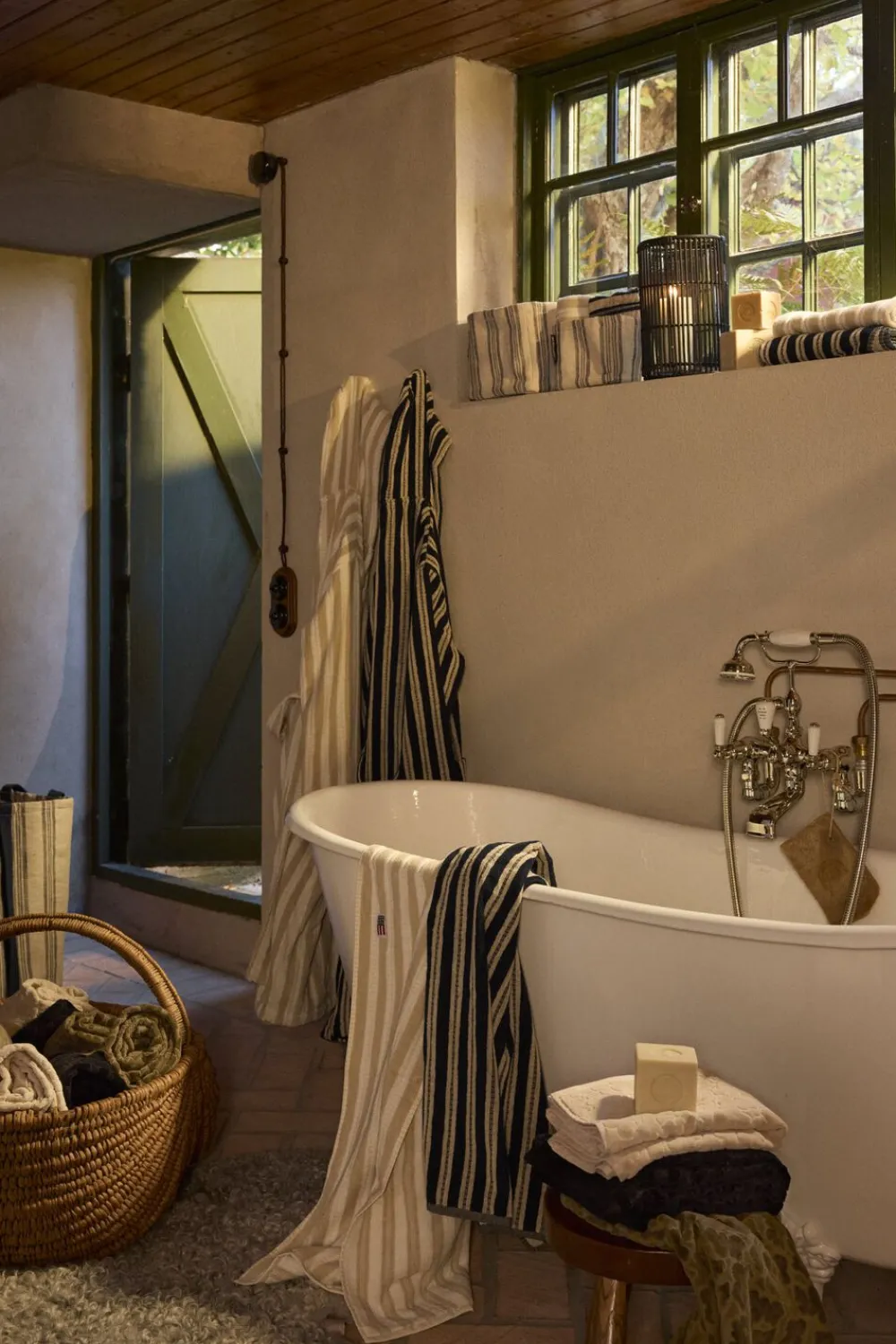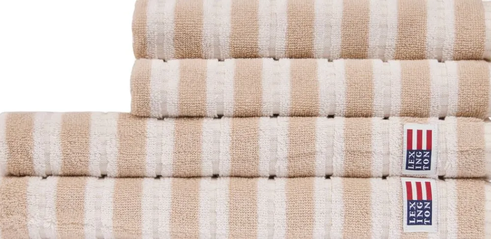 Løft din badeværelsesoplevelse med vores Stribede Terry Håndklæde i Lysbeige/Offwhite. Fremstillet af førsteklasses 500gsm ringspundet bomuld tilbyder dette luksuriøse håndklæde enestående absorberingsevne og blødhed, der holder vask efter vask. De elegante garnfarvede striber og præcist foldede kanter skaber et raffineret udseende, der fremhæver ethvert badeværelsesinteriør. Hvert håndklæde har vores karakteristiske Lexington-flaglogomærke og en praktisk ophængningsløkke for nem tørring. Kombiner med vores matchende Stribede unisex badekåbe for et komplet, koordineret look, der bringer spaagtig luksus til din daglige rutine.
