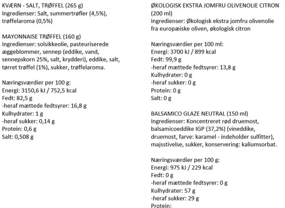 De ultimative delikatesser til alle som sætter pris på høj kvalitet og gourmetmad. Indeholder: Balsamicocrème, økologisk eksta jomfru olivenolie med citron, trøffelmayonnaise, og saltkværn med trøffelsalt samt et inspirationskort med en opskrift, hvor delikatesserne anvendes. Posen er vedlagt og delikatesserne kan nemt pakkes deri. Gaveposen er produceret i et stærkt materiale og har et vindue med et kig til delikatesserne.