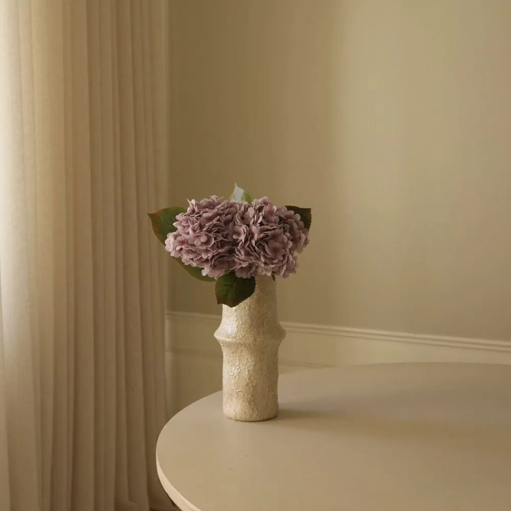 Denne Light Purple Hydrangea Flower stem har en Single stor blomst med lagdelte kronblade i dæmpede lavendel og støvede lilla toner. Kranserne har en blød, fløjlsagtig tekstur og ledsages af brede, åregrønne blade. Den robuste grønne frempind har en naturlig finish og når en højde på 49 cm. Den store keramiske jordvase på billedet måler 30,5 cm i højden og 10 cm i diameter.