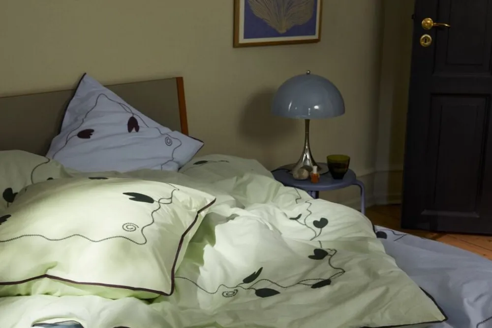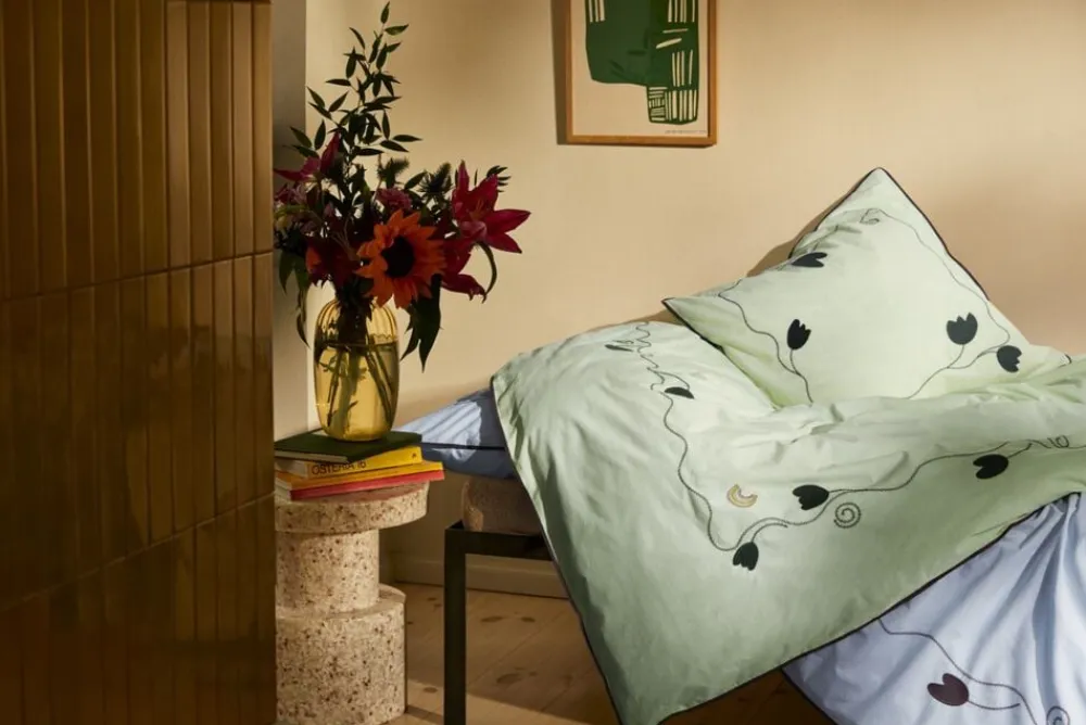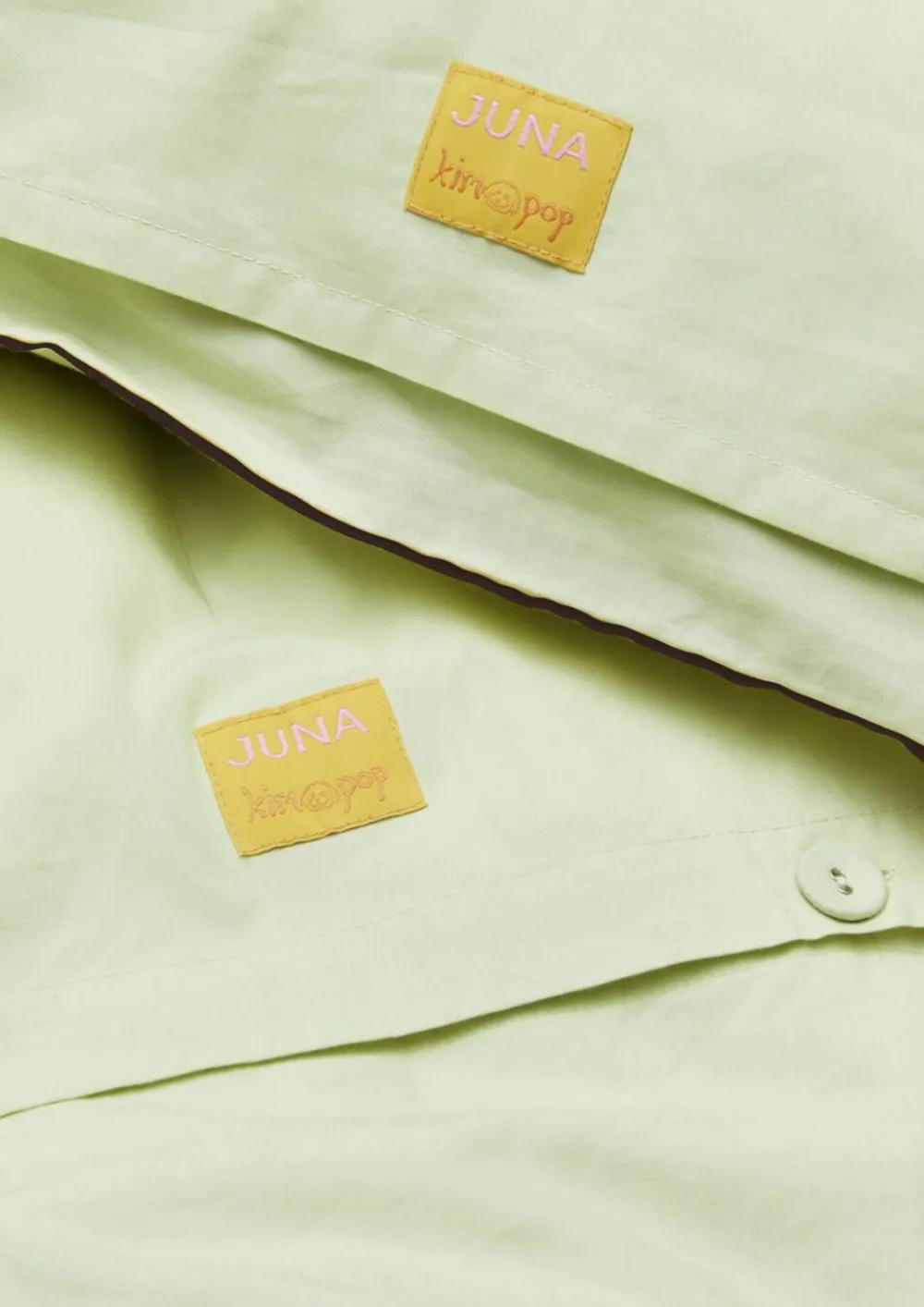 Mærk stemningen af bølgede blomsterranker i et opfriskende og trendy farveskema med masser af moderne kant. Med designsamarbejdet JUNA X KIMPOP fortolker de farverige personligheder Sofie Linde og Joakim Ingversen JUNAs drømmende univers i deres farverige, legende og unikke stil under navnet KIMPOP. Og med sengetøjet i Lollipop-kollektionen får du et fantastisk flow af broderede blomsterranker, der smukt og drømmende bølger sig ned over både pudebetræk og dynebetræk for en farvestrålende og fantasifuld stemning i soveværelset, i sofaen, i lænestolen, på din daybed, eller hvor du ellers hygger dig med din dyne og pude. Præcis ligesom JUNA ønsker Sofie Linde og Joakim Ingversen at skabe en hyggelig og uhøjtidelig følelse med deres tekstildesign, der inspirerer til store drømme i farverige omgivelser. Dette sengesæt til dyner med almindelig længde måler 140×200 cm og kommer i en sart lysegrøn prydet med broderede blomsterranker i mørkegrøn en både sofistikeret og sensuel farvekombination, der forstærkes af den fremtrædende piping hele vejen rundt langs kanten i en trendy bordeaux farve. Og du bliver selvfølgelig heller ikke snydt for Lollipops signaturregnbue, som du finder broderet i sin mangfoldige skønhed øverst til venstre på dynebetrækket. Lollipop-sengetøjet er fremstillet i 100% økologisk bomuld, der er GOTS-certificeret, så du lunt og trygt kan nyde en god nats søvn, og når du kommer helt tæt på, vil du ud over detaljerne med blomsterrankerne også virkelig kunne se og mærke lækkerheden i den tætte og fine bomuldspercale, der giver stoffet en blød og glat tekstur. Samtidig med at være ekstremt behagelig at sove i får du med percalevævningen også et meget slidstærkt og holdbart sengesæt i en eksklusiv kvalitet, som du kan have glæde af nat efter nat og år efter år. Pudebetrækket har kuvertlukning, mens dynebetrækket lukkes med knapper. Har du flere forskellige Lollipop-sengesæt fra JUNA, kan du lege med at blande de forskellige farver for at skabe lige præcis den følelse af cosy cocooning, der passer til dig og dit soveværelse. Med Lollipop og JUNA kan du gøre lige, hvad du drømmer om. (GOTS Organic Certified by Control Union, 1026087)