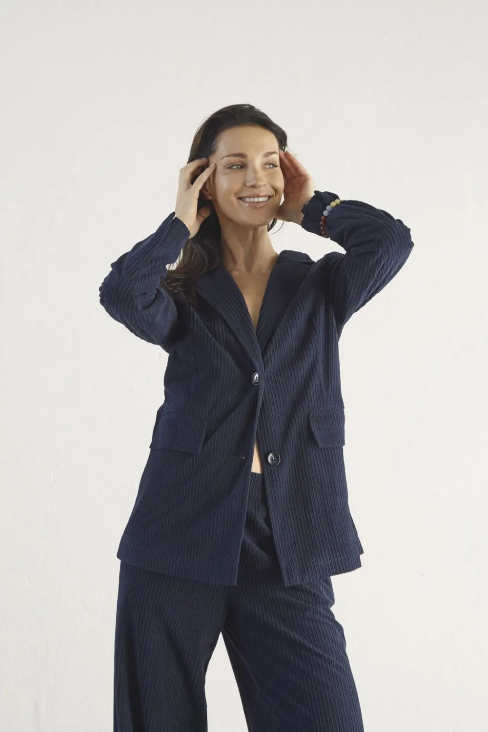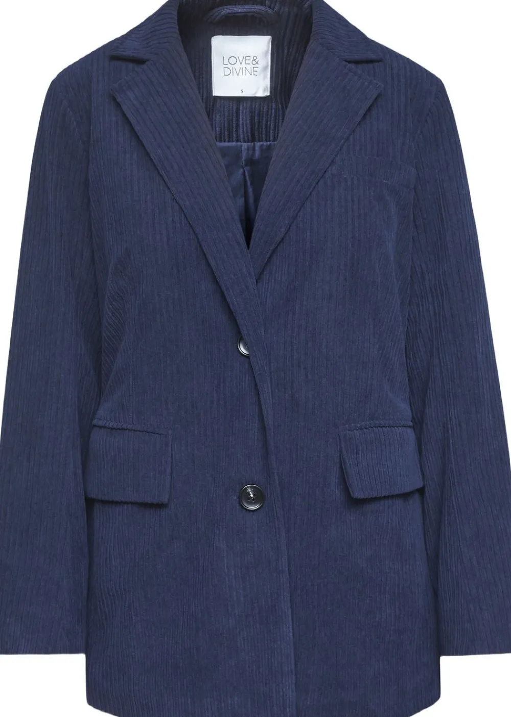 er en fløjlsblazer med en let oversized pasform. Blazeren har to luknings knapper og to påsyede lommer foran. Modellen har en str. S på.