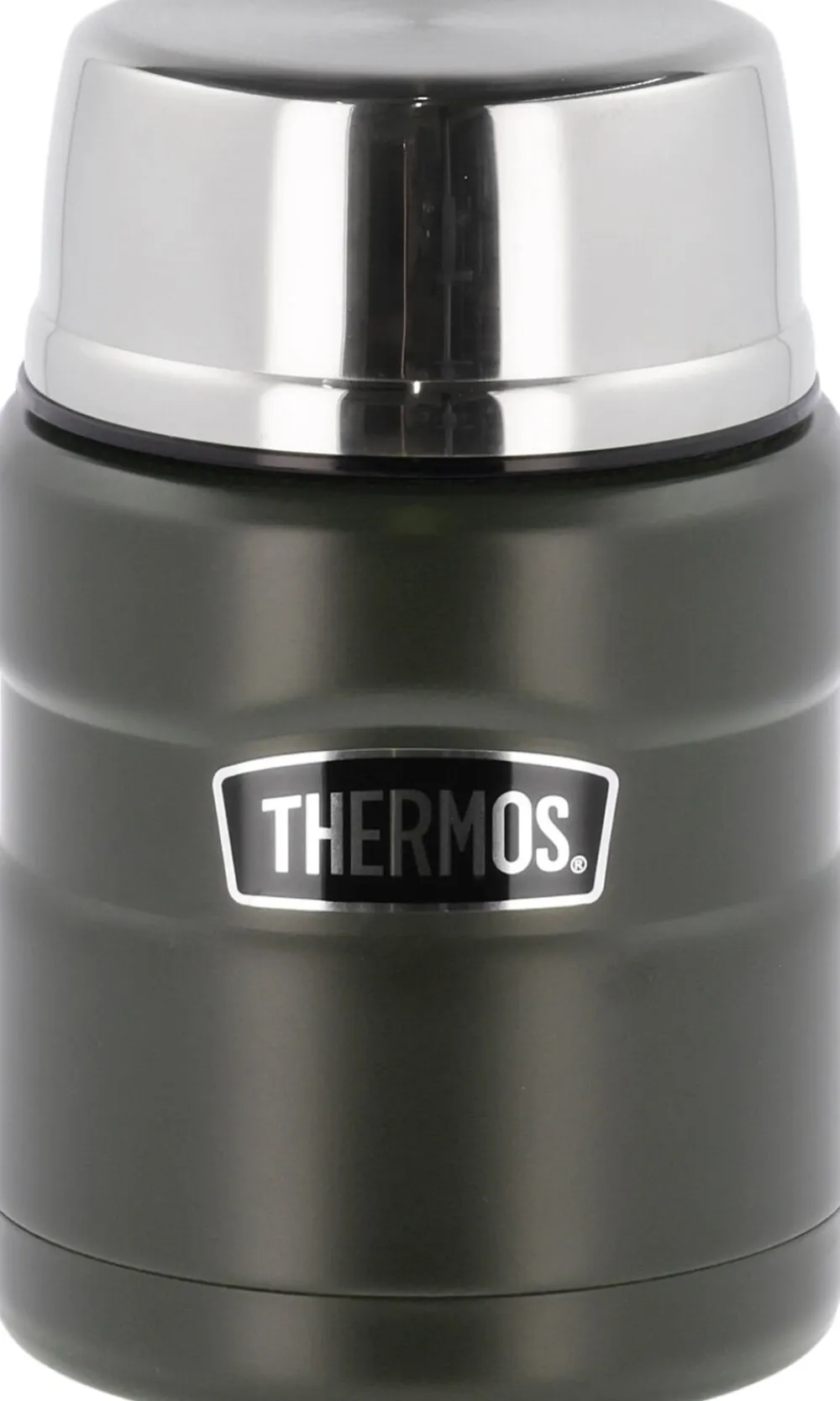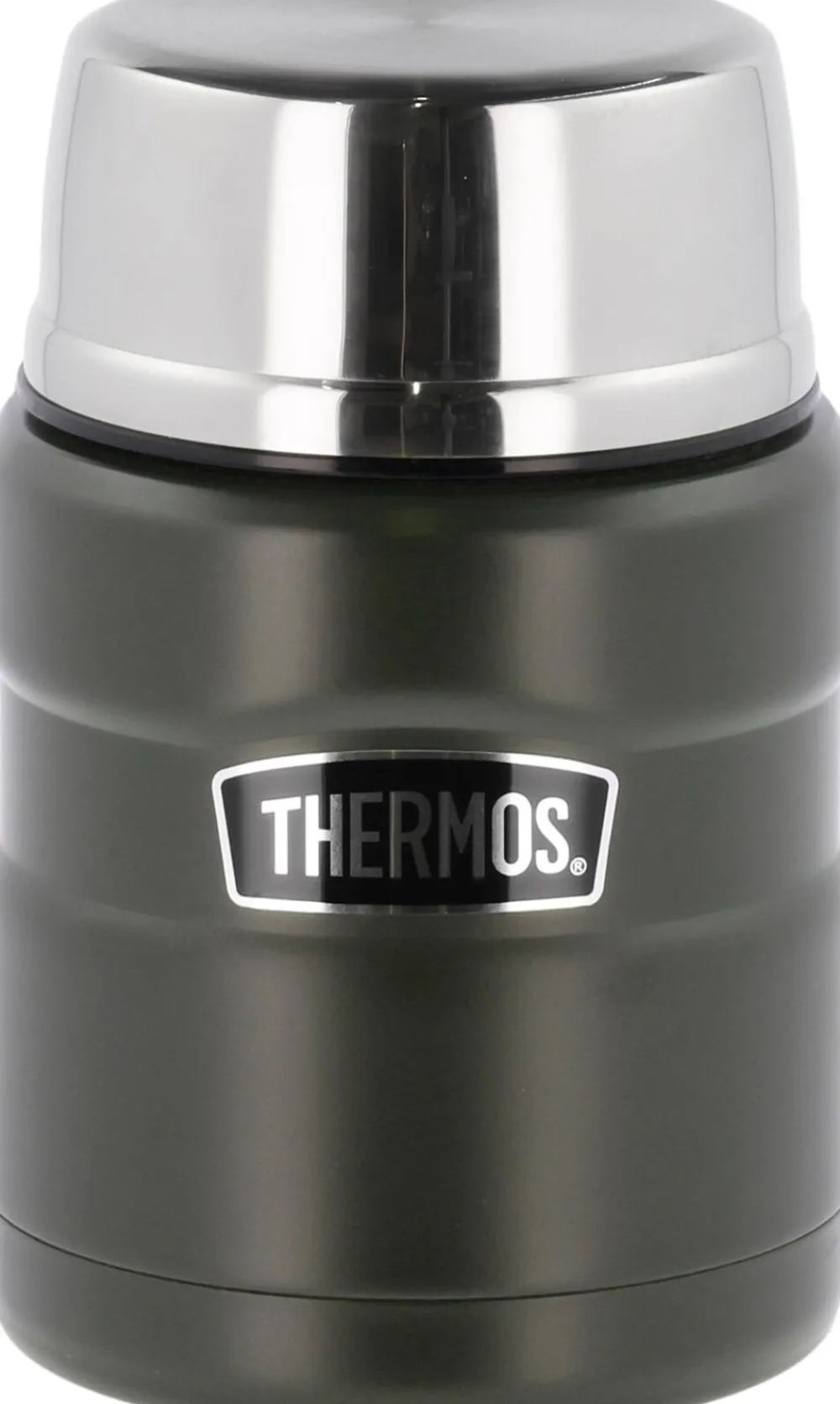 Thermos Stainless King 470 ml madtermoflaske i rustfrit stål med foldbar ske i låget. Låget kan bruges som spiseskål til fx suppe eller som kop til dine drikkevarer. Velegnet til både kolde og varme drikke, og holder indholdet varmt i op til 14 timer og koldt i op til 24 timer.