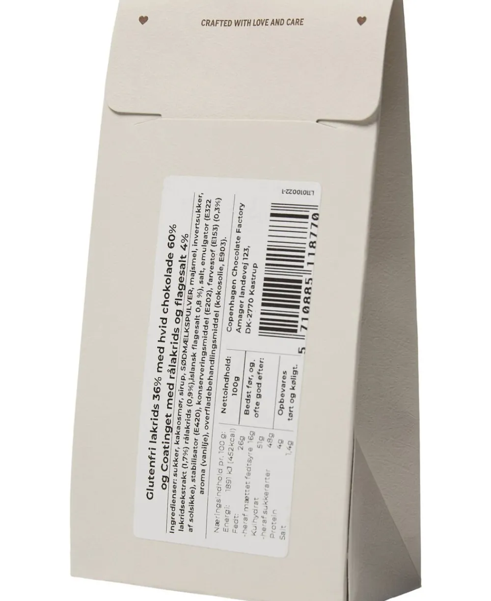 Lakridsdragé fra Magasin du Nord Chocolate med hvid chokolade og coating af rålakrids med flagesalt i en dekorativ æske. Lakridsen er glutenfri, produceret i Danmark og er lavet af udsøgte råvarer. Forkæl dig selv eller en du har kær med denne fine gaveæske.