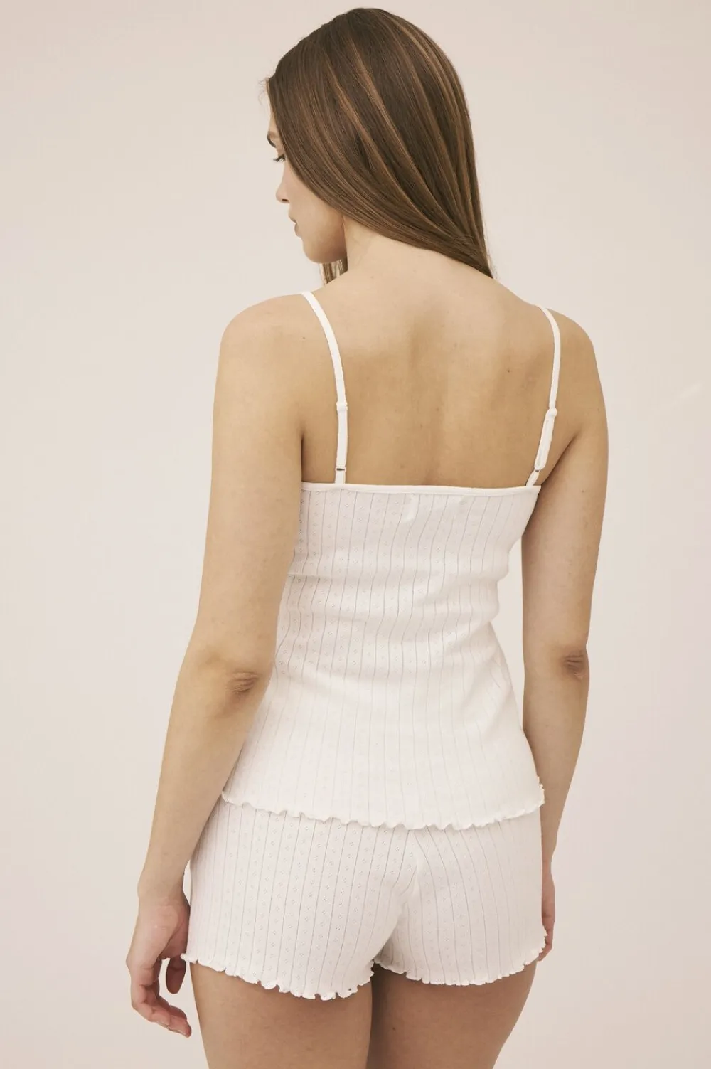 Top fra Magasin du Nord Collection i den blødeste kvalitet af 100% økologisk bomuld med GOTS-certificering. Toppen er enkel i modellen med et fint mønster, smalle skulderstropper, rib og blondekant i den runde halsudskæring samt elegante bølgekanter i bunden. En skøn top i den lækreste kvalitet.