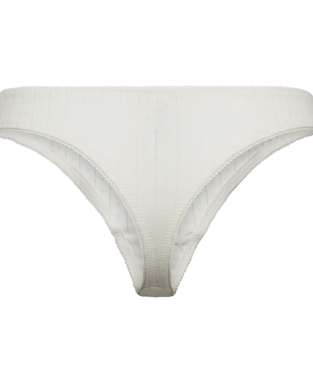 G-streng fra Magasin du Nord Collection i den blødeste kvalitet af 100% økologisk bomuld med GOTS-certificering. G-strengen er enkel i modellen med det fineste hulmønster, en foret kile, fine blondekanter samt en lille sløjfe på fronten. En skøn g-streng i den lækreste kvalitet.