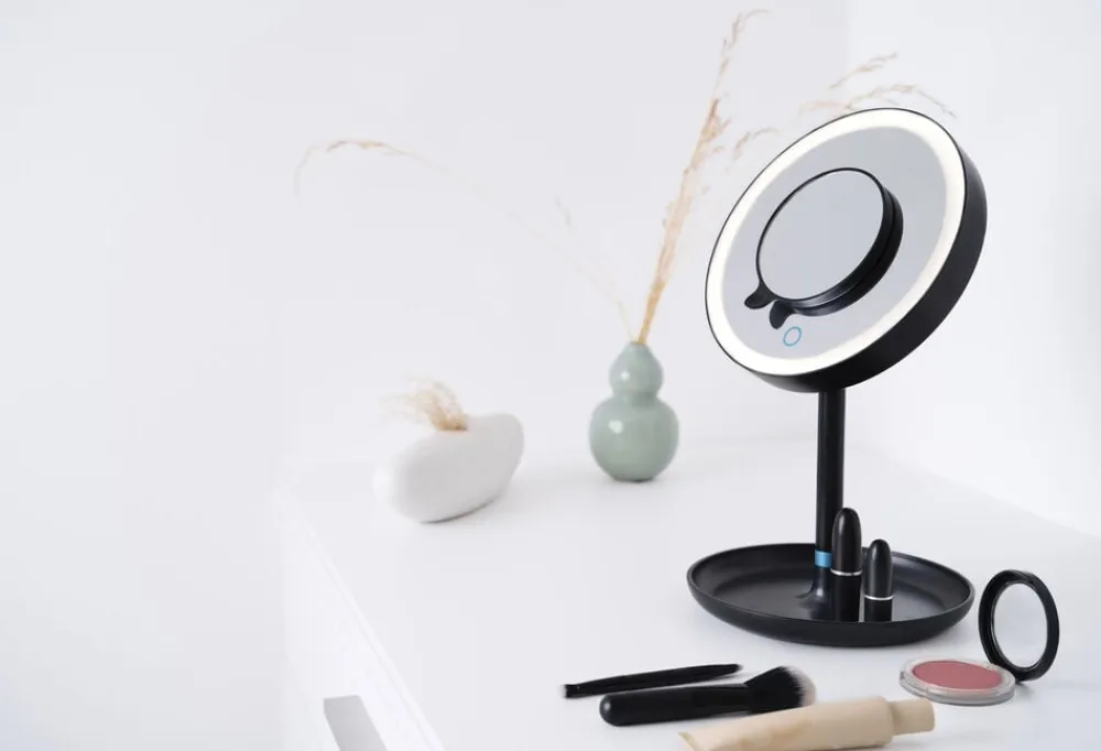 Makeup spejl BS 45 i flot sort Limited Edition udgave. Kosmetikspejlet har en ekstra stor spejlflade på 17,5 cm med LED lys rundt om. Lyset kan justeres med touch knappen.