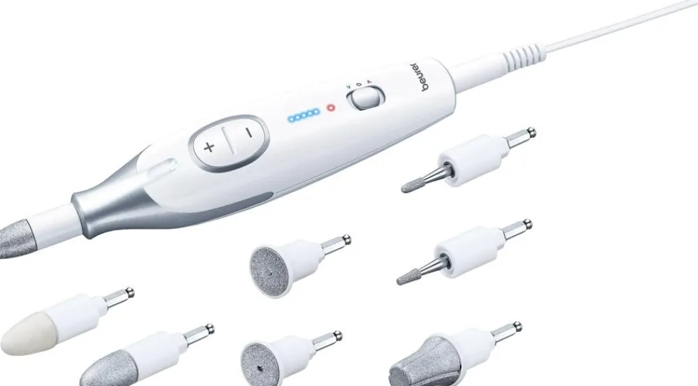 Et komplet manicure- og pedicuresæt til smukke negle på hænder og fødder. Sættet er både til begyndere og øvede. Apparatet har trinløs justerbar hastighed, der både kan rotere mod højre og venstre, samt LED lys der gør det lettere at se området der behandles. Hastighederne er mellem 3800 og 4600 RPM +/- 15%. Der medfølger 7 forskellige bits, til alt lige fra fjernelse af tør hud, polering af neglene, filing og afkortelse af neglene og en fræser til løsning af indgroede negle. Bits’ne er også velegnet til diabetikere. Der medfølger desuden en praktisk opbevaringstaske.