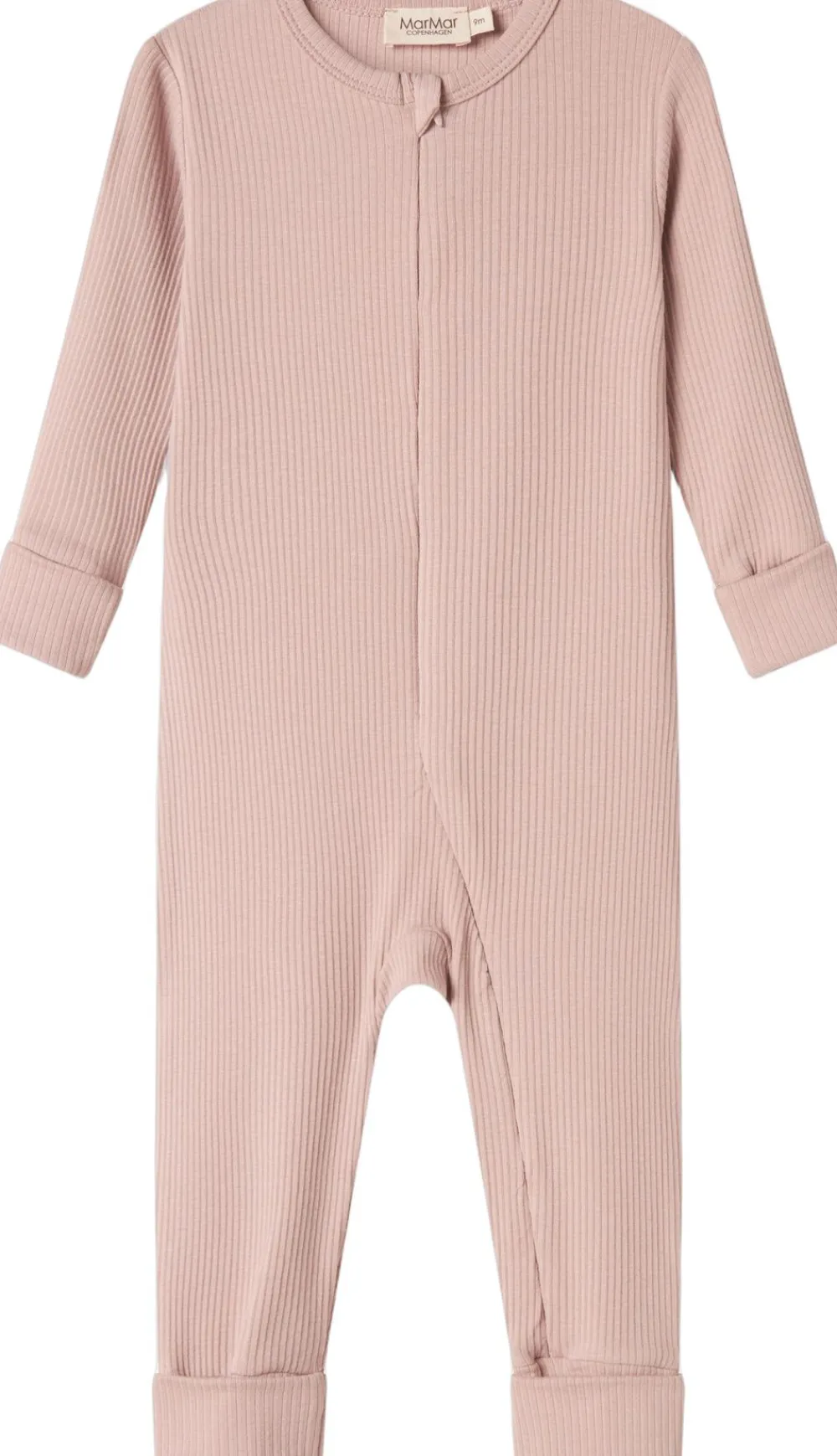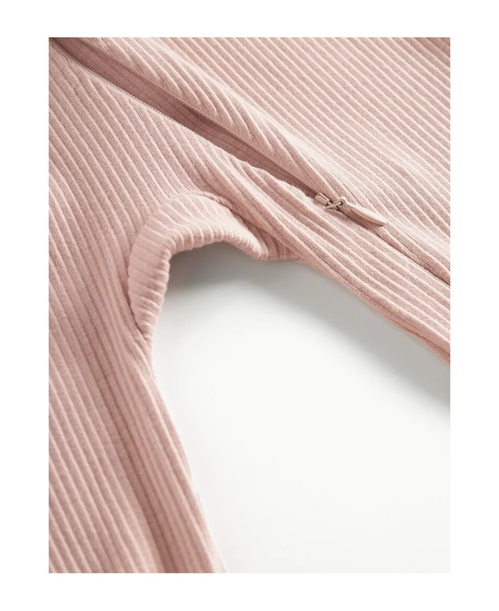 Enkel langærmet heldragt der kan lynes helt fra hals og ned langs det ene ben med lynlås for nem bleskiftning. Heldragten har ombuk ved både ærmer og ben, som kan justeres i takt med barnets væks. Heldragten har ydermere foldbar vante/strømpe funktion fra str. 2-4M. Heldragten er ribstrikket, blød, strækbar og behagelig at have på.