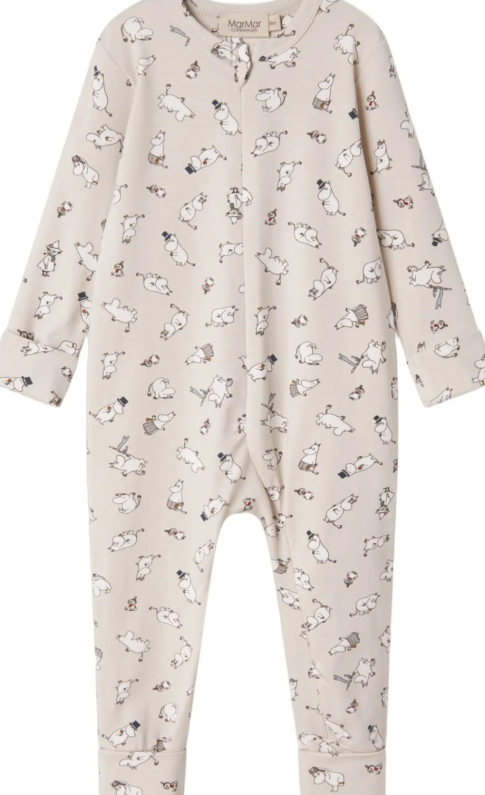 Enkel langærmet heldragt med sødt Moomin print, der kan lynes helt fra hals og ned langs det ene ben med lynlås for nem bleskiftning. Heldragten har ombuk ved både ærmer og ben, som kan justeres i takt med barnets væks. Heldragten har ydermere foldbar vante/strømpe funktion fra str. 2-4M. Heldragten er både blød, holder form og farve og har elastan i sig som gør den strækbar og behagelig at have på.