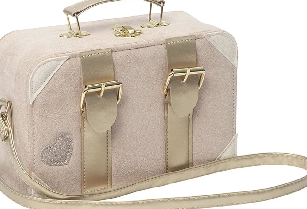 Firkantet skuldertaske i lyserødt velour med håndtag, strop, lynlås og gyldne kuffert-dekorationer.