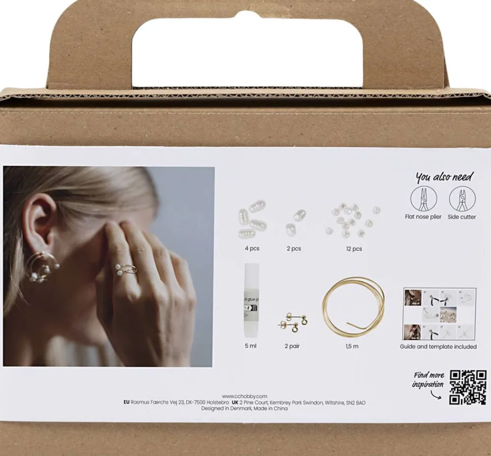 Med dette kit kan du lave smykker ud af smykkewire og perler. Skab trendy øreringe både spiraler og sløjfer samt en unik fingerring. Indeholder alle de materialer du skal bruge, og al den vejledning du behøver. Er du altid med på den sidste nye smykkemode, så er dette kit lige noget for dig. Med kittet kan du skabe elegante smykker med masser af wauw-effekt. Du former smykkerne af forgyldt smykkewire, og tilføjer enkle perlemors voksperler som pynt. Lav to sæt øreringe et par flotte spiral øreringe og et par søde sløjfe øreringe. Du kan også kreere din helt egen ring i samme stil.