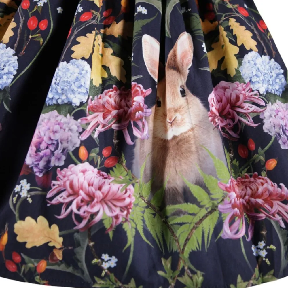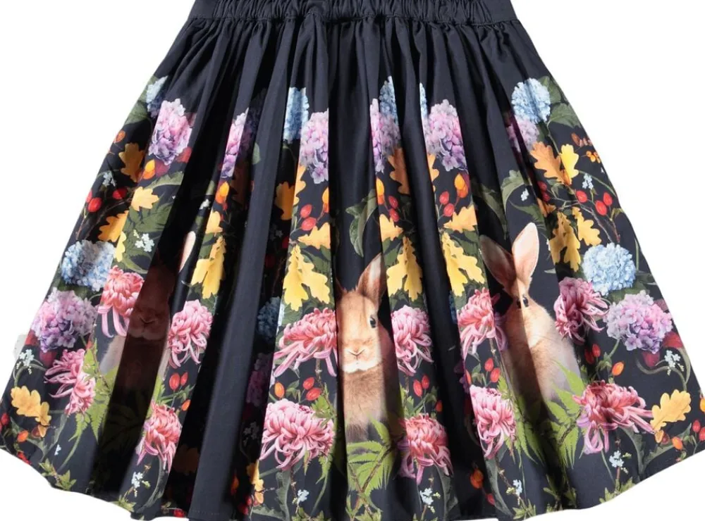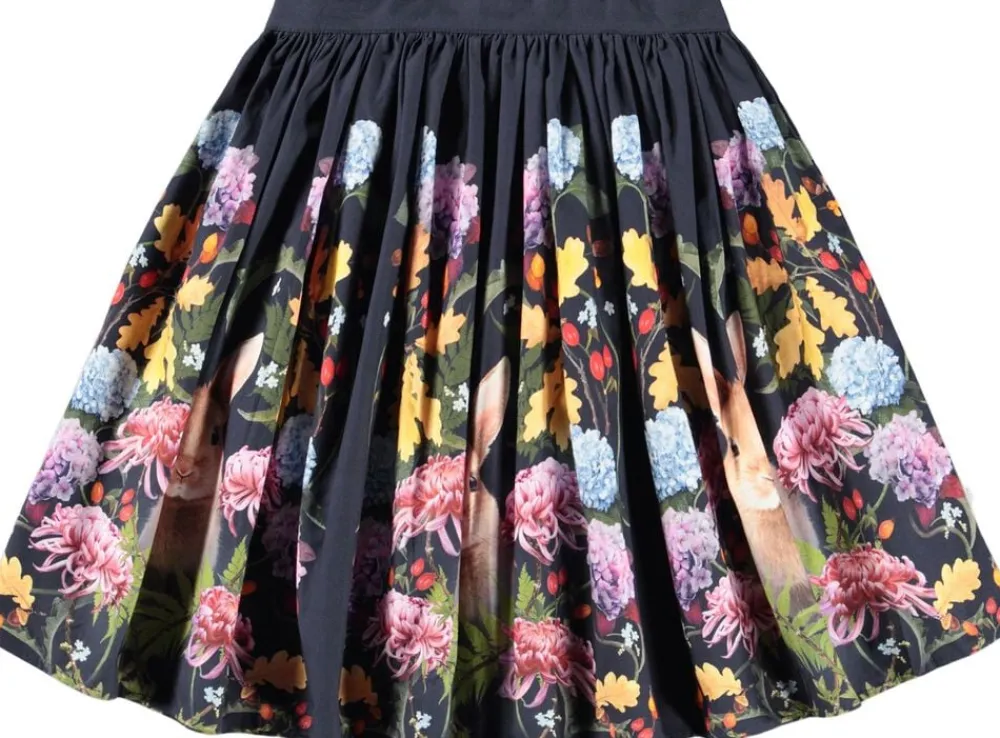 Denne mørkeblå knælange nederdel fra Molo er lavet af økologisk bomuld og har et sødt print af blomster og kaniner. Nederdelen har en fast talje foran og elastik bagpå, hvilket gør den nem at komme i og behagelig at have på. Skørtet rynker rundt i taljen og giver nederdelen en flot volumen.