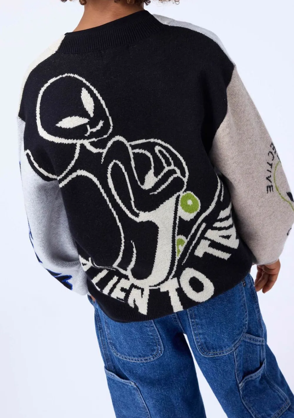 Denne multifarvede strikcardigan fra Molo er lavet i bomuld og uld og har en V-halsudskæring, knapper, ribstolpe og rib ved ærme og hofte. Cardiganen har en almindelig pasform og et mønster af forskellige grafik samt en stor alien bagpå.