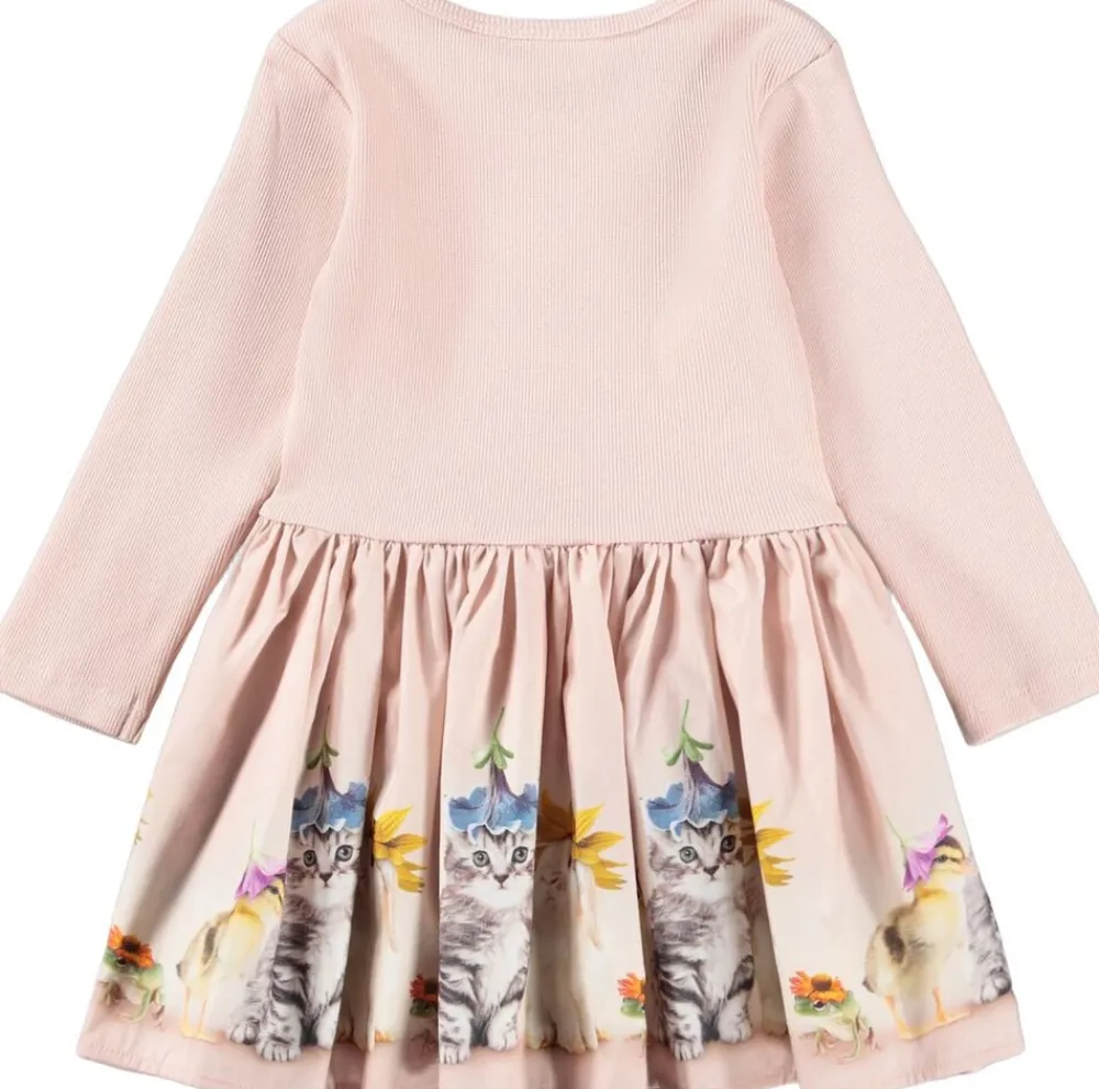 Langærmet kjole til baby med dyreprint på skørtet, fremstillet af blød ribbet jersey. Toppen sikrer en tætsiddende pasform, mens det lette poplinskørtsdesign tilføjer dejlig volumen. Denne kjole er komfortabel og perfekt til leg. Den er nem at tage af og på, hvilket gør den til en praktisk løsning for forældre, der ønsker stil og funktionalitet i hverdagen.
