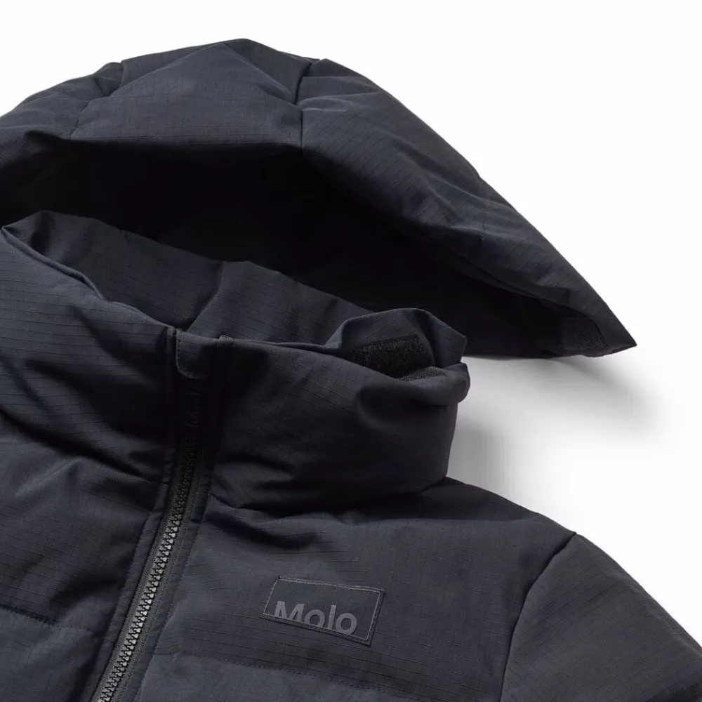 Denne sorte jakke fra Molo er lavet i genanvendt nylon og har en praktisk lynlåslukning, høj krave og aftagelig hætte. Jakken har en længde til over knæet og er designet med frontlommer, en indvendig lomme samt ribkant ved håndleddene. Høje slidser med trykknapper i begge sider sikrer stor bevægelsesfrihed og gør jakken praktisk når du skal cykle. Bagpå er der en stor refleks.