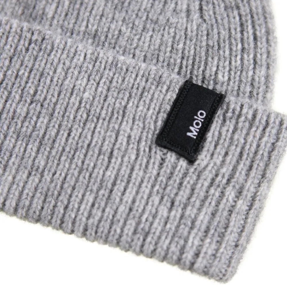 Grå ribstrikket hue i uld fra Molo med ombuk og Molos logo.
