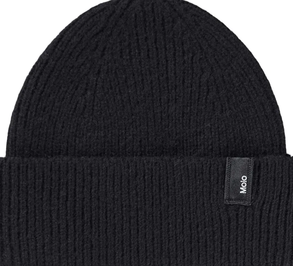 Sort ribstrikket hue i uld fra Molo med ombuk og Molos logo.