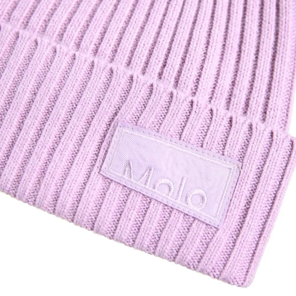 Ribstrikket hue fra Molo med ombuk og Molos logo på fronten.