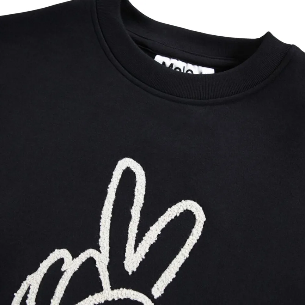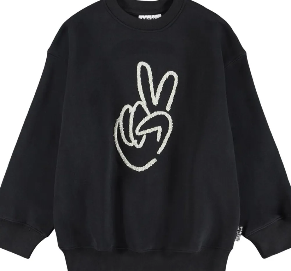 Denne sorte sweatshirt fra Molo er fremstillet i blødt økologisk bomuld og dekoreret med et stort print af et fredshåndtegn. Designet har en oversize pasform og ribkanter ved hals, ærmer og bund.