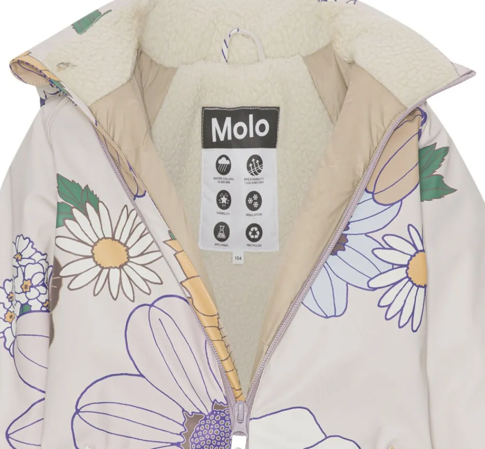 Fin, rosa flyverdragt af naturgummi med flot, farverigt blomsterprint på både forside og bagside. Paco-flyverdragten er en del af Molos nye overtøjskollektion ‘Rubber Excellence’, som byder på alt hvad barnet har brug for, for at holdes tør og varm i alt slags vejr. Flyverdragten er både vind- og vandtæt, samt åndbar til en hvis grad. Overfladen er blød og smudsafvisende og kan nemt rengøres, når den bliver mudret til. Paco-dragten er godt isoleret, har lækkert fleecefor og fungerer fint til moderat kolde vintre. Den lukkes med lynlås på fronten, har elastikkant ved ærmer og ben samt aftagelige gummistropper ved fødderne. Refleksdetaljer sikrer bedre synlighed i trafikken. Vandsøjletryk: 8.000mm. Åndbarhed: 3.000 g/m2/24t. Ydermateriale, for, samt inderstof er fremstillet delvist af naturgummi og delvist af genanvendt polyester fra brugte plastikflasker og andet restaffald. Herved bruges der langt færre ressourcer samt en væsentlig mindre udledning af CO2. Miljøvenlig vand- og smudsafvisende coating uden brug af kemikalier som PFOS, PFOA og lignende.