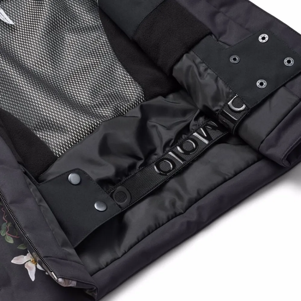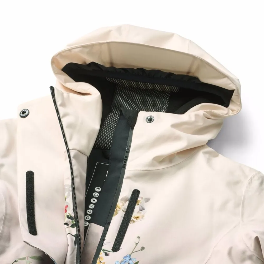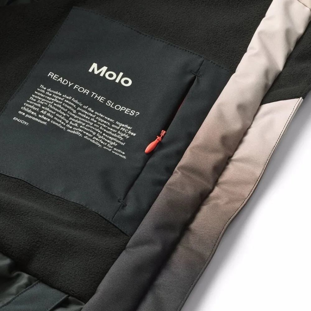 Denne vinterjakke fra Molo er lavet i genanvendt polyester. Jakken har en foret hætte, praktisk lynlås med overfald og vandtætte lynlåslommer. Der er en lomme på ærmet til skikort og en indvendig lomme til ekstra opbevaring. Jakken har vindfang ved hoften, velcro om håndleddet og ærmeåbninger med tommelfingerhul, som effektivt holder sne, vind og vand ude. Ydermere er jakken foret med fleece og vatteret med 3M Thinsulate.