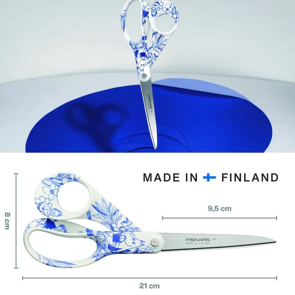 Den inkluderer en hyldest til Tove Janssons liv og værk med HARU’s harmoniske blå og hvide farver. Med inspiration af klippeøen Klovharun, hvor Tove tilbragte sine somre, og de kranse, hun designede fra den omgivende flora, vækker Moomin Fiskars-universalsaksen 21 cm Haru de dejlige og sjove mumikarakterer til live. Fiskars-sakse er lavet med knive i rustfrit stål af høj kvalitet med en præcisionsslebet kant, der holder sig skarp længere og skærer helt ud til spidsen. Det lette, ergonomisk formede håndtag giver komfort og kontrol. Fremstillet i Finland, håndtestet.