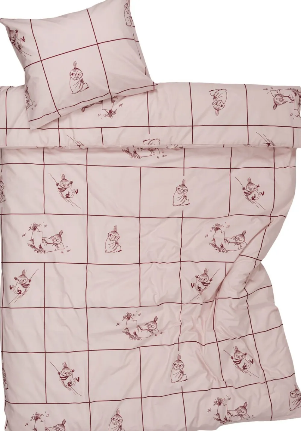 Hvem kunne være surere over at blive vækket fra sin hi midt om vinteren end Lille My? I dette pinkternede sengetøj har et egern gnavet et lille hul i Lille Mys sovepose, men vinteren udenfor tilbyder alle mulige sjove aktiviteter selv for dem med det syrligste humør såsom glatte bakker, man kan kælke på. Moomin Arabia sengetøj 140×200, Lille My tern