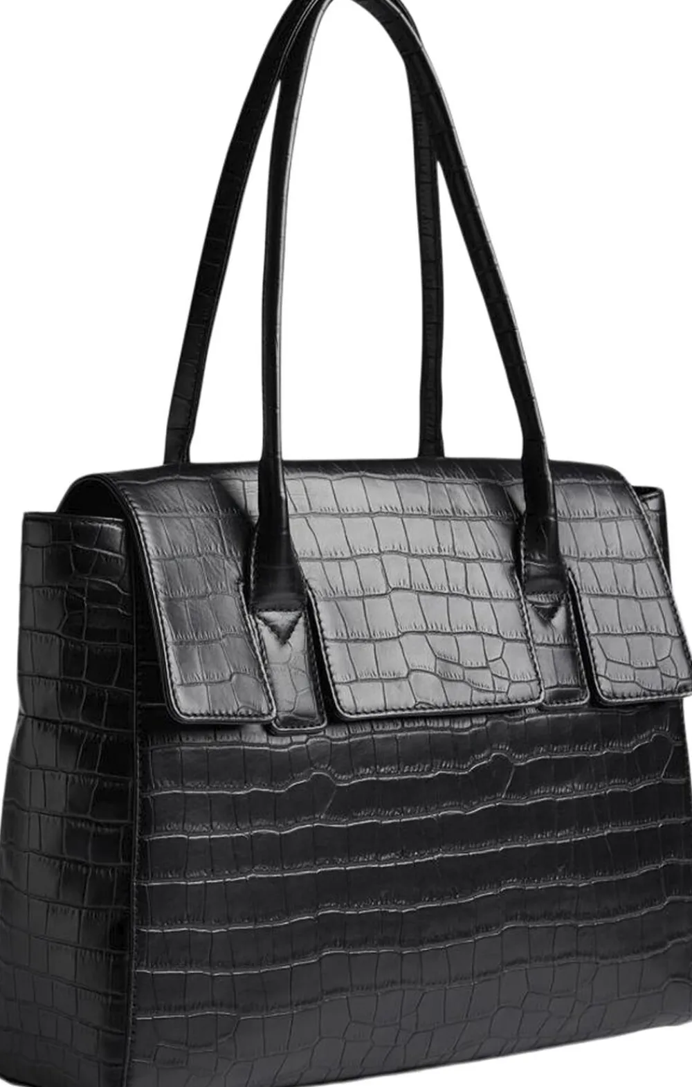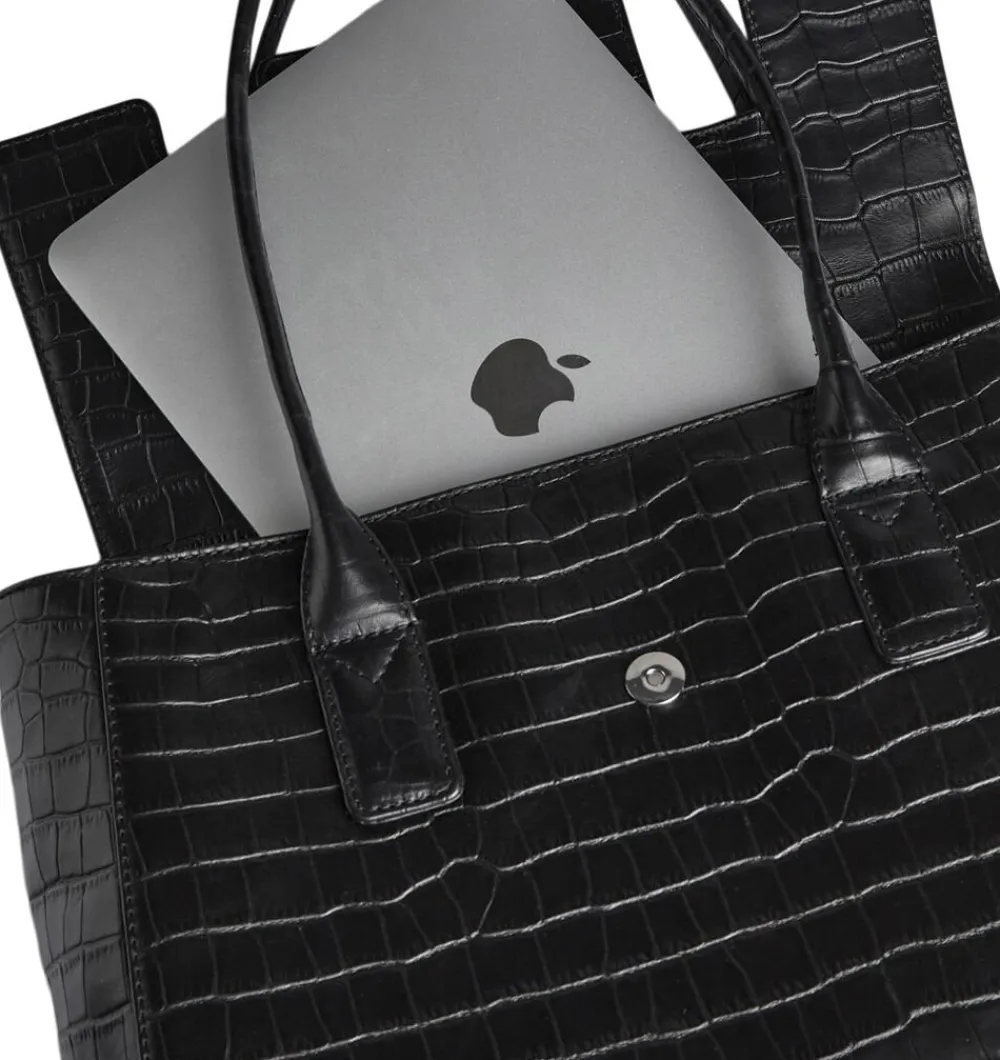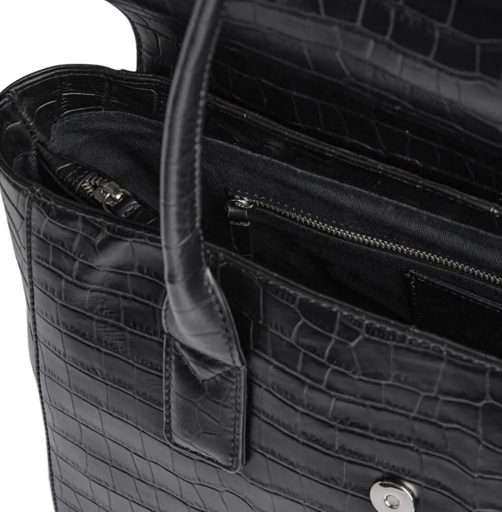 Natalie Work Bag fra Markberg er en stilfuld og funktionel arbejdstaske, ideel til moderne kvinder, der ønsker både praktisk opbevaring og elegant design. Tasken er fremstillet af kalveskind, med et cool croco udtryk. Tasken har to indvendige lynlåslommer, to ekstra rum samt to små lommer, der gør det nemt at organisere dine ejendele. Den har plads til en 14 computer, hvilket gør den perfekt til arbejde eller studier.