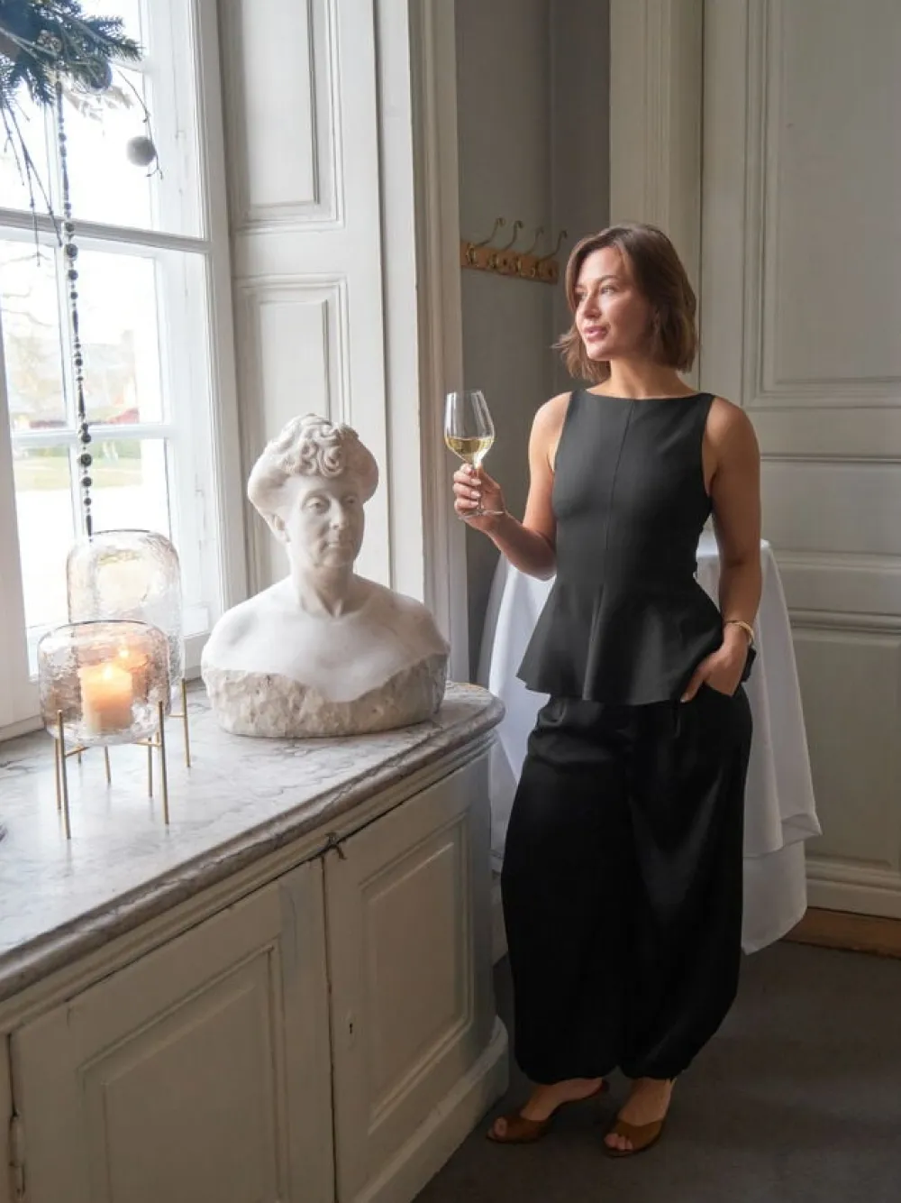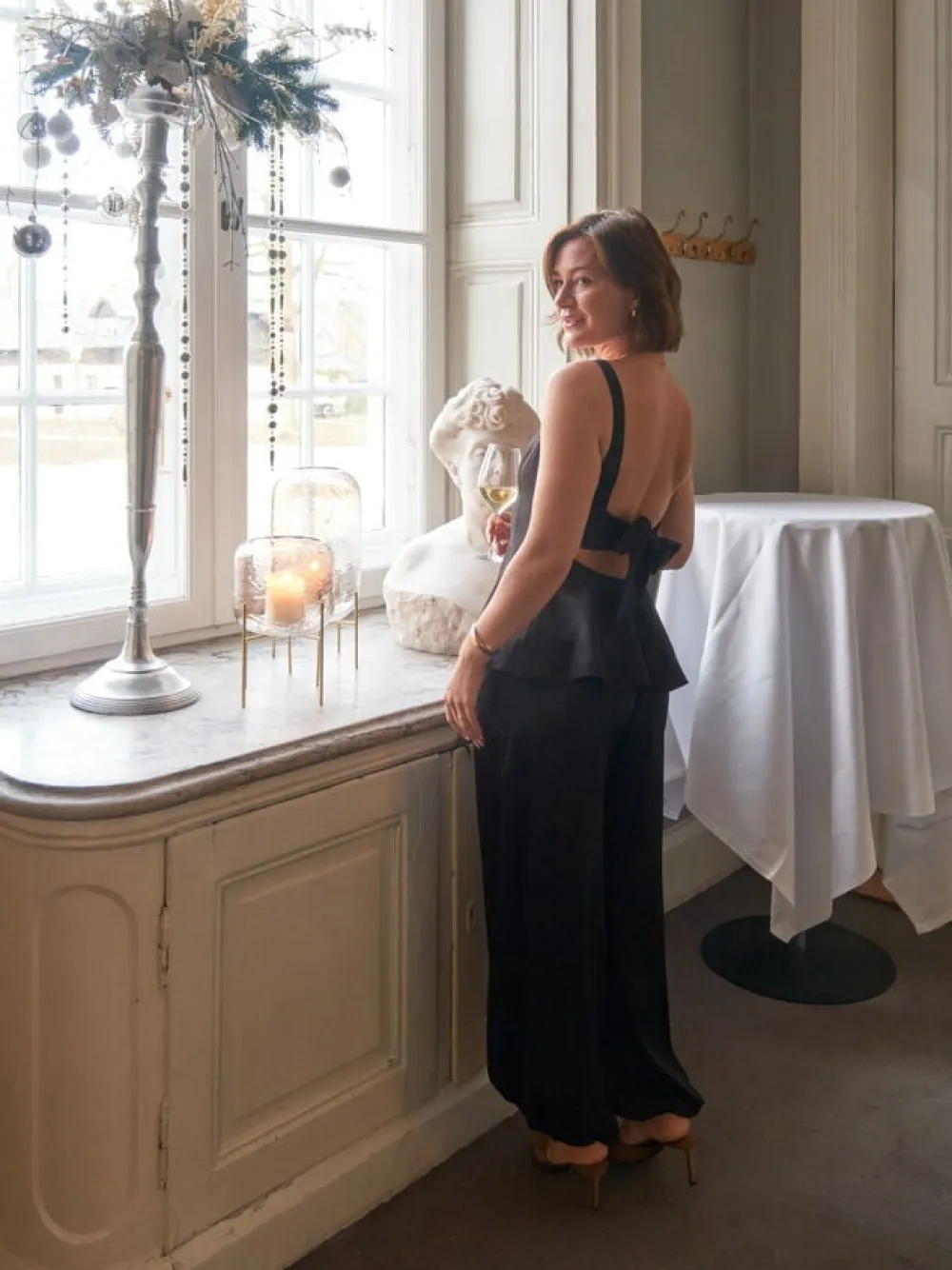 Ærmeløs top med åben ryg. Toppen har en rund halsudskæring, vidde i bunden og bindes på ryggen. Den har en almindelig pasform. Modellen er iført størrelse 36.