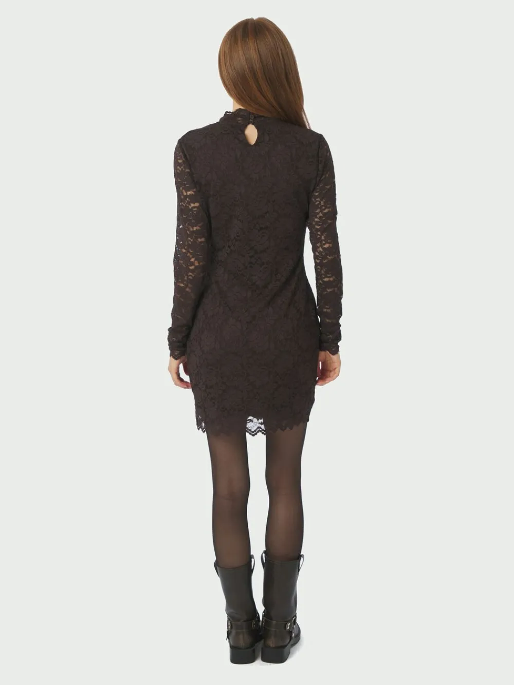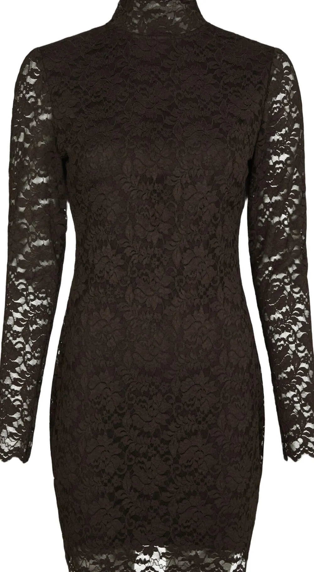 Kort kjole i blonde. Kjolen har en høj hals, tungekanter og lukkes med en nøglehulslukning i nakken. Den har en påsyet underkjole på kroppen, som gør, at den ikke er transparent. Pasformen er tætsiddende, og materialet indeholder stræk. Modellen er iført størrelse 36.