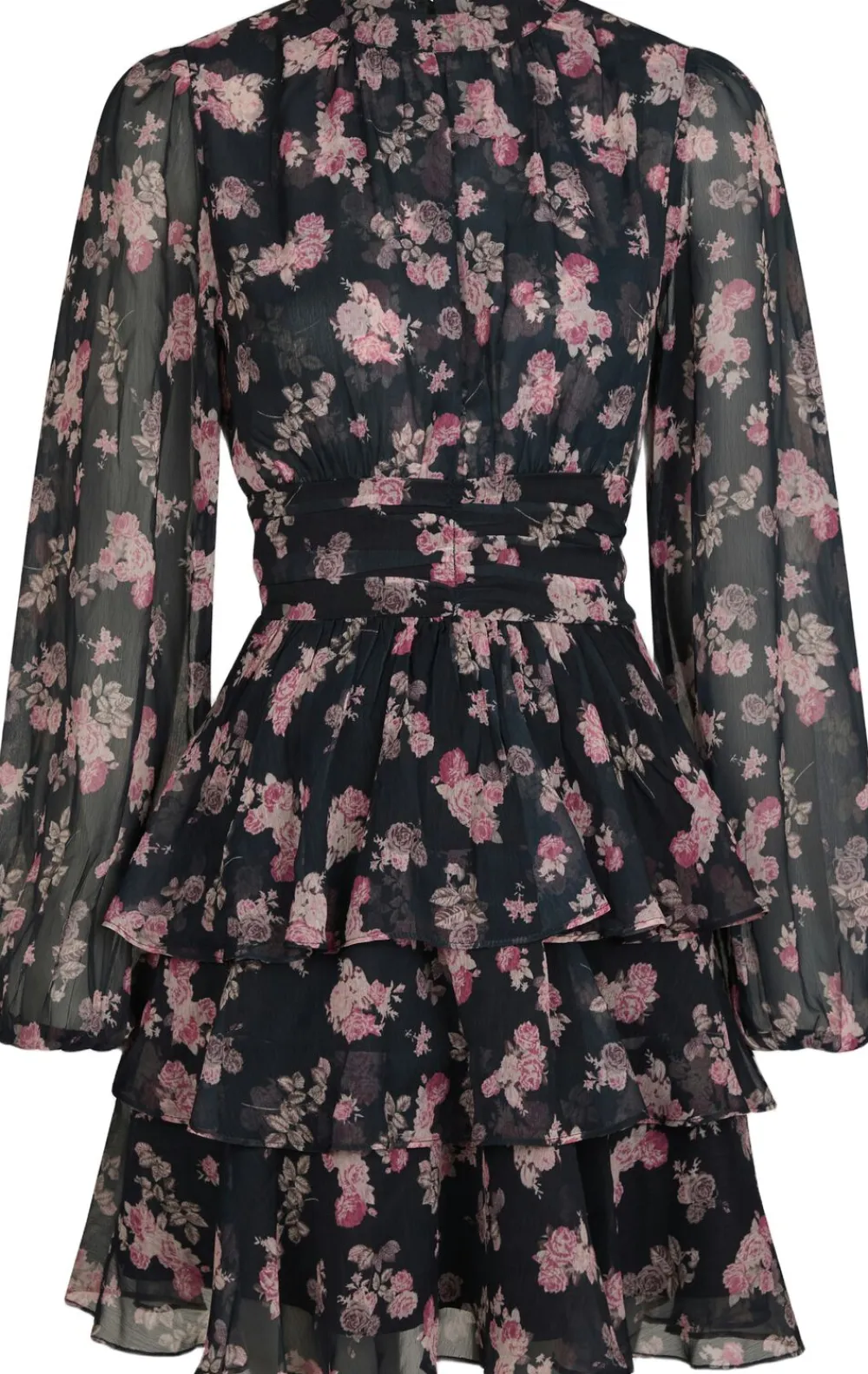 Flot kjole med flæser og lange ærmer med vidde. Kjolen kommer i et blomsterprintet chiffon materiale. Modellen er 176 cm høj og bærer størrelse 36.