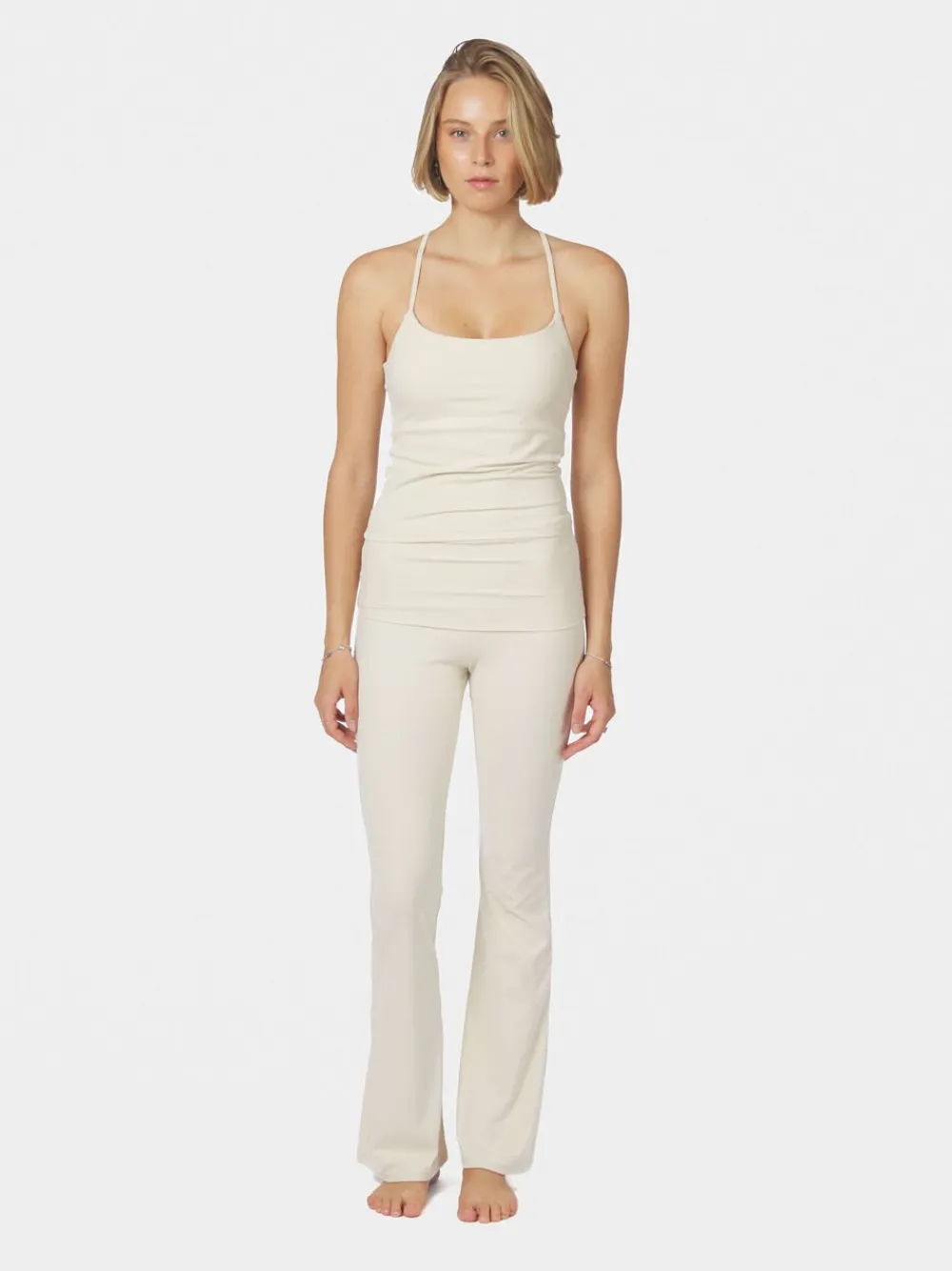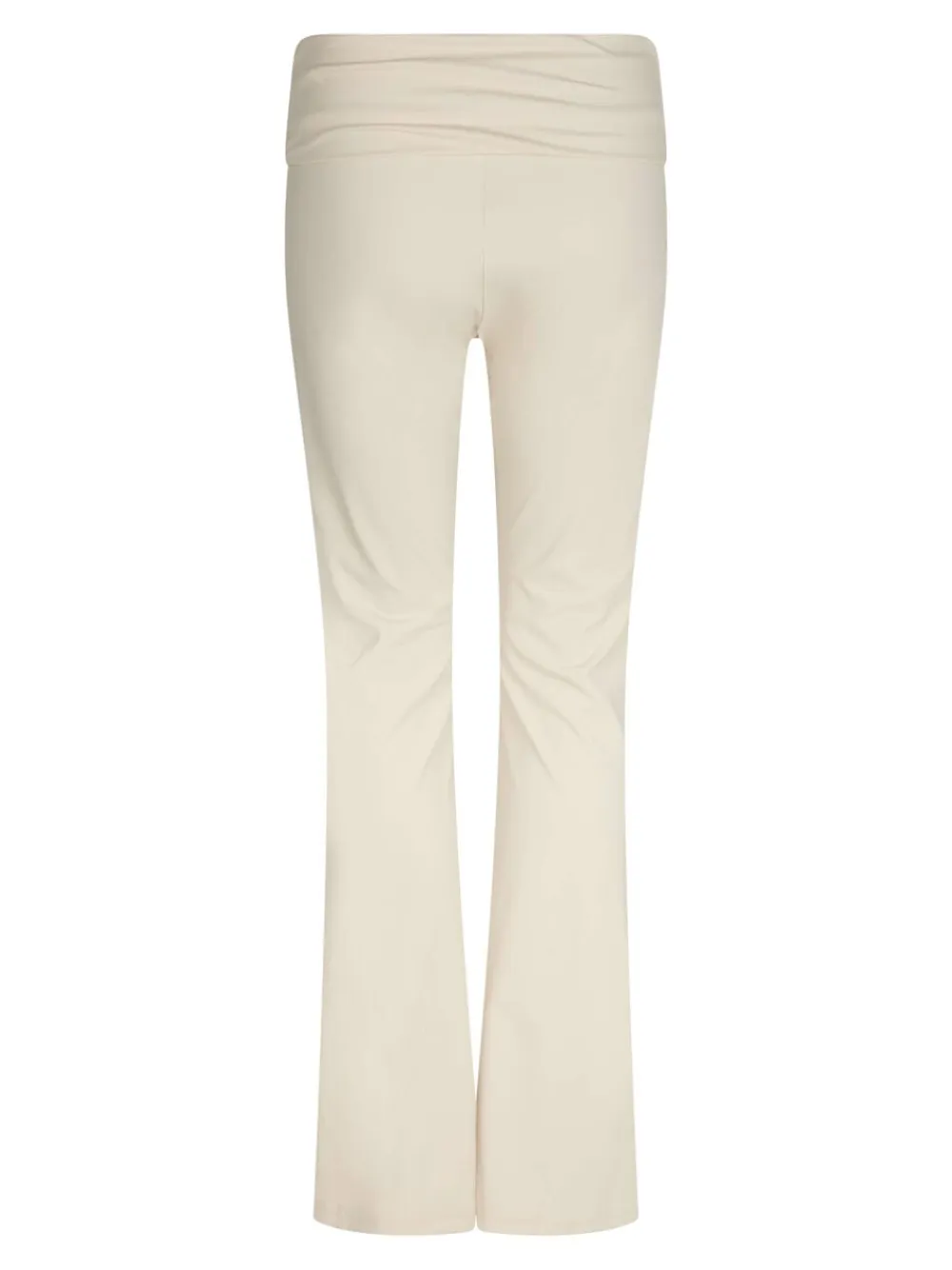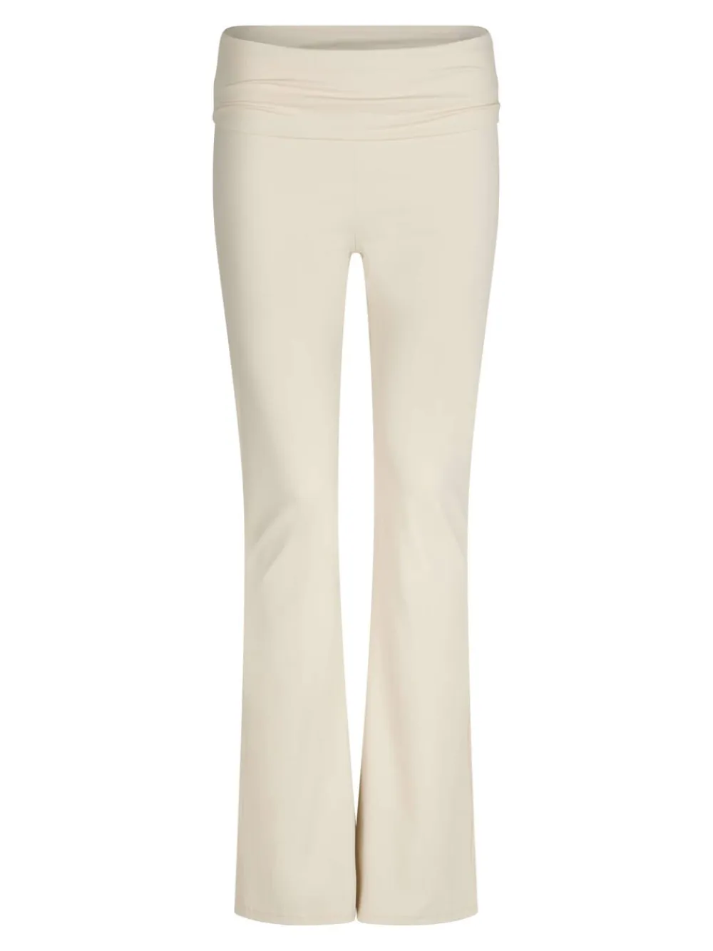 Højtaljede bukser med flared ben. Bukserne har en høj linning, der kan foldes ned. De er lavet i et materiale med meget stræk. Modellen er iført størrelse 36.
