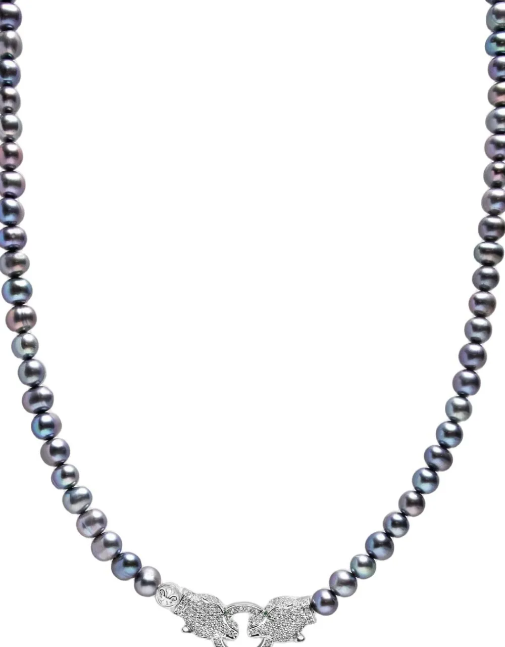 Sort perlechoker med dobbelt panterhoved i sølv, kultiverede ferskvandsperler, omtrentlig perlestørrelse 6-7 mm, lås i allergivenligt rustfrit stål med klare CZ-diamanter, model iført 20 tommer halskæde. – Seværdigheder i Los Angees