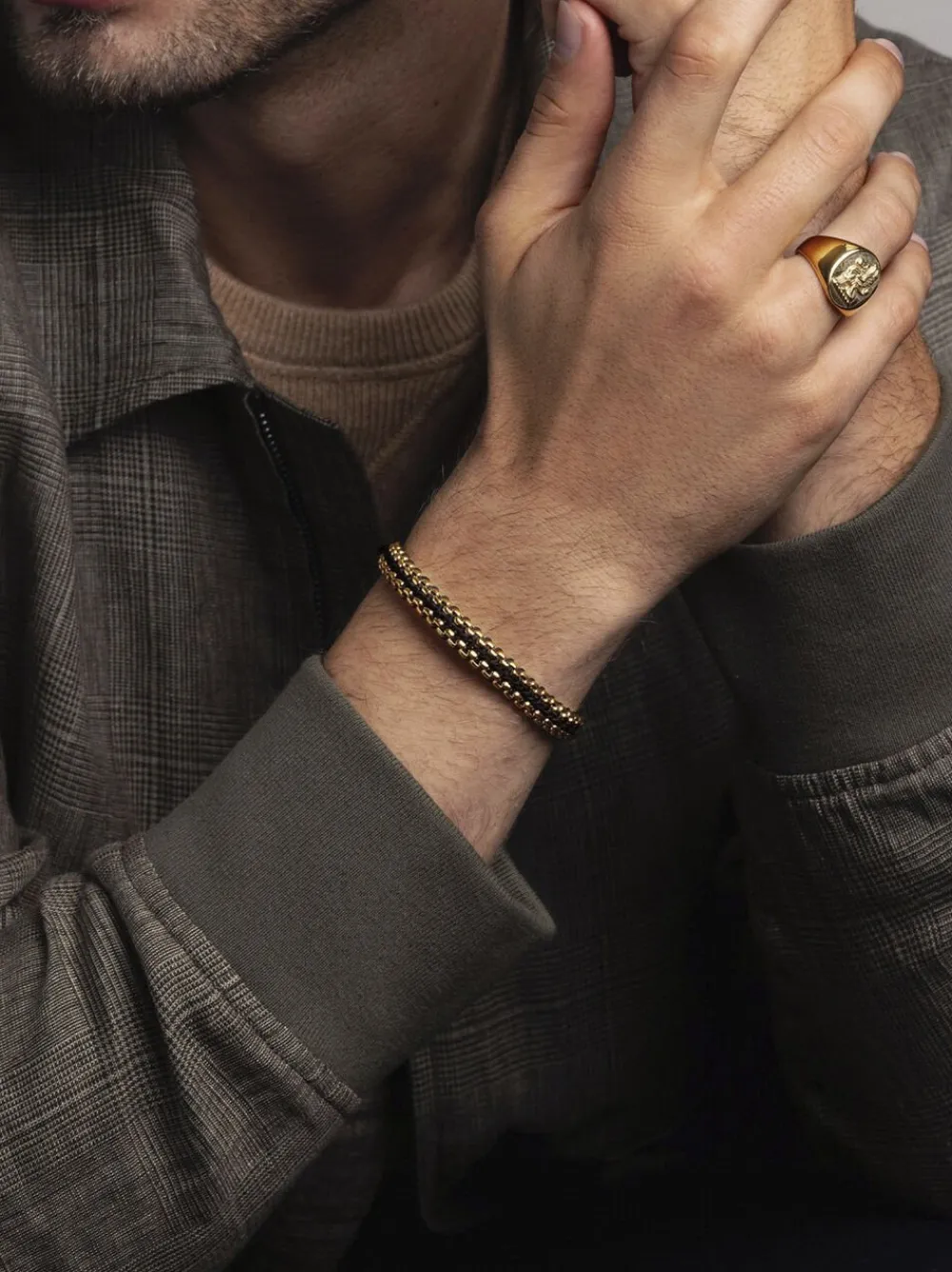 Black Woven Box-kædearmbånd til Herre i rustfrit stål med guldplade og lås i rustfrit stål med guldplade. Armbåndsbredde: 8 mm. Håndlavet i Los Angeles