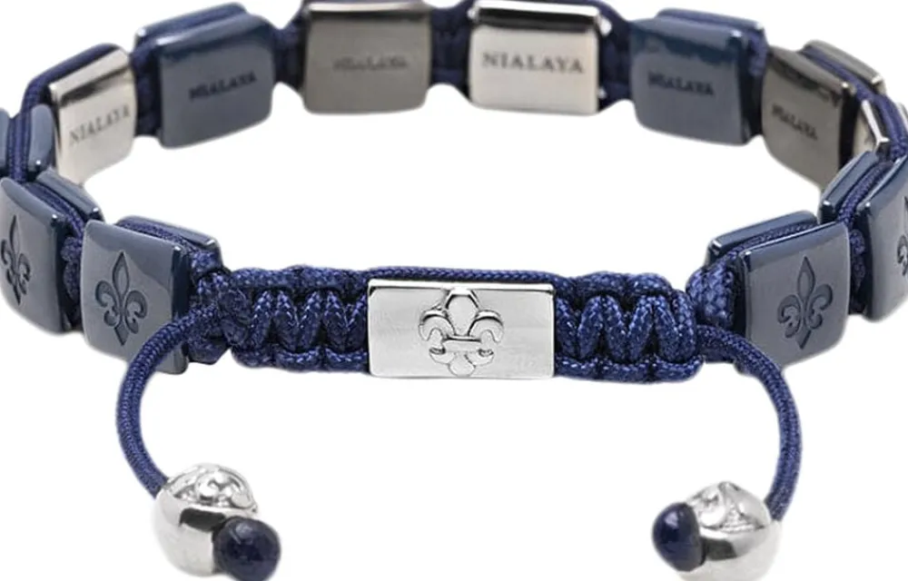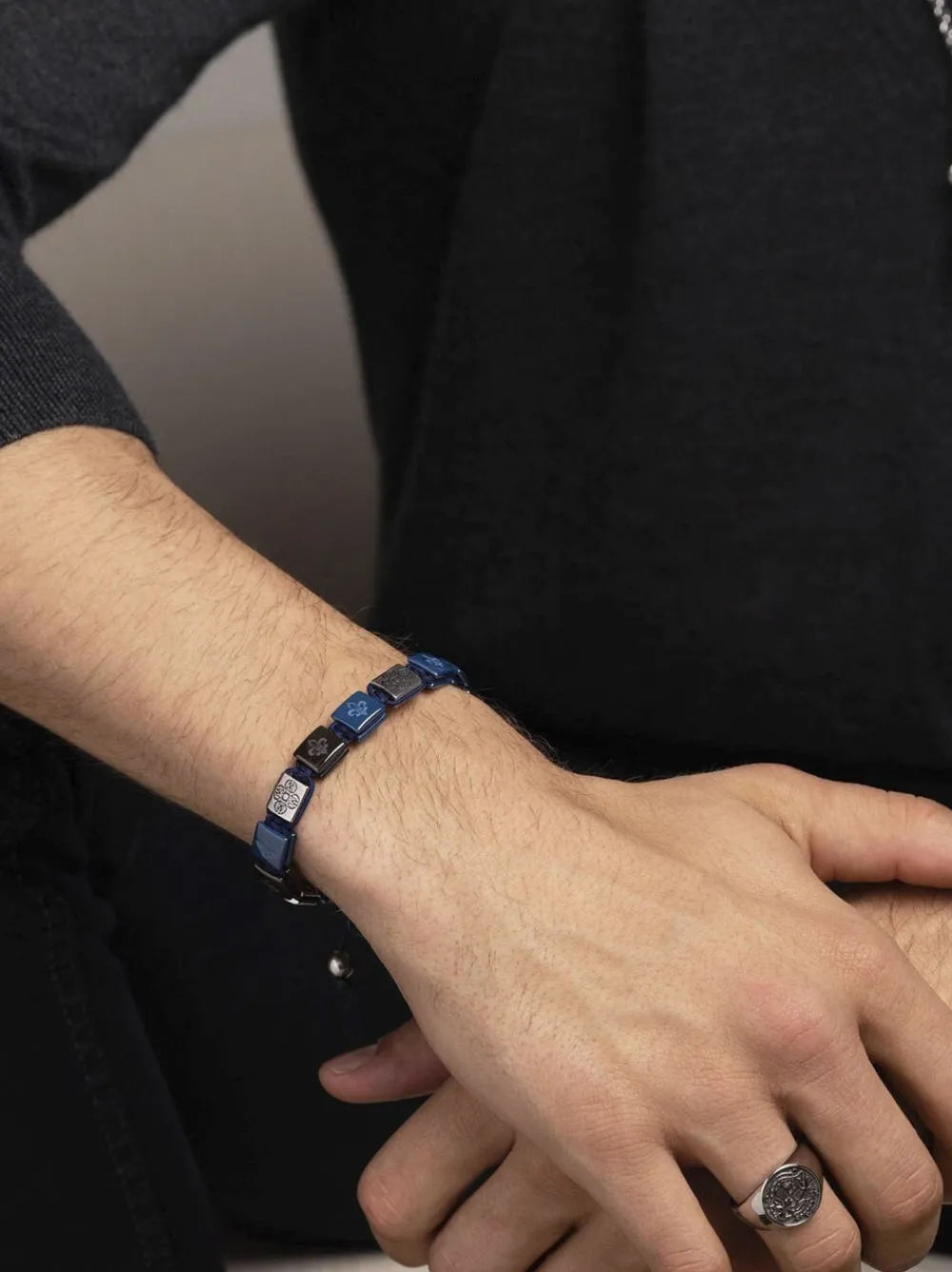 Armbånd med blå håndlavede keramiske perler, sølvdorjeperler i rustfrit stål. Perlestørrelse: 9 mm x 10 mm. Lås i rustfrit stål. Håndlavet i Los Angeles
