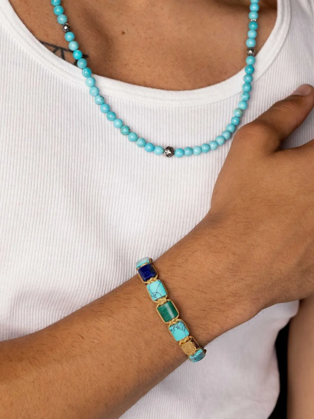 Bracelet with Turquoise, Blue Lapis,ÂRed Jade, Green Jade, and Brown Tiger Eye. Dorje Beads in Stainless Steel with GoldÂPlating. Black/Gold CZ Diamond Bead. Bead Size: 9mm x 10mm and Lock in Stainless Steel withÂGold Plating. Handmade in Los Angeles