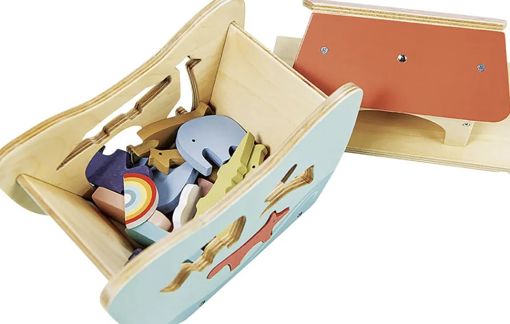 Noahs ark puttekasse med 6 dyrepar i træ, designet til små hænder.